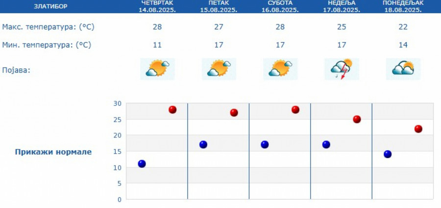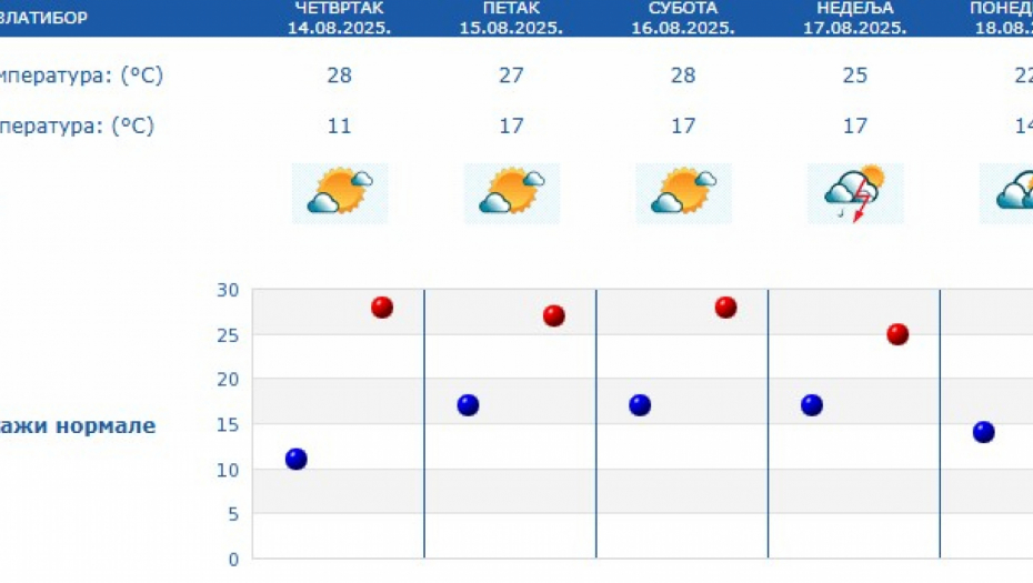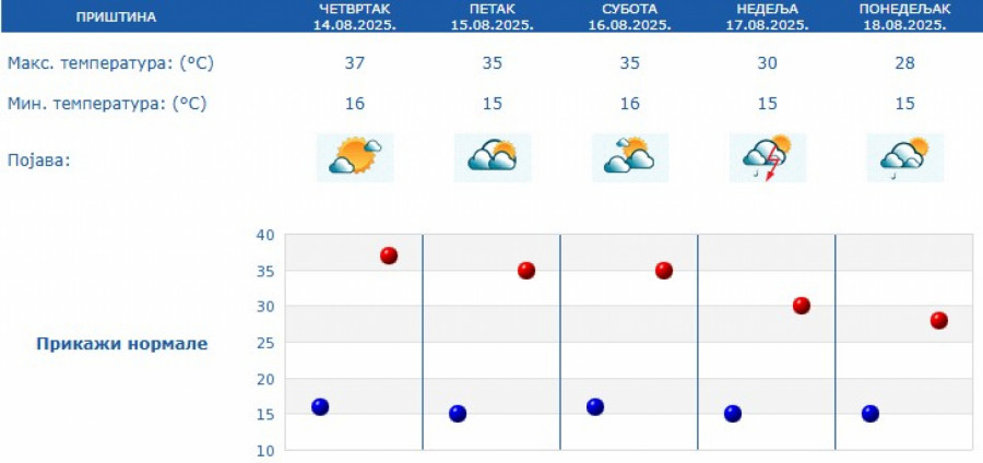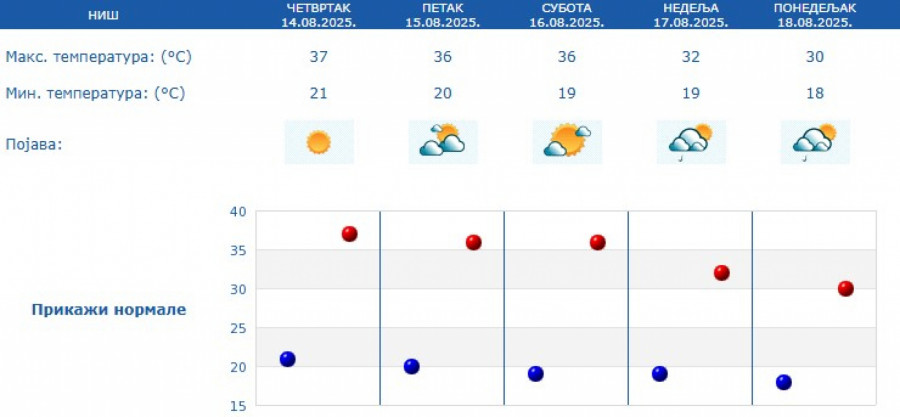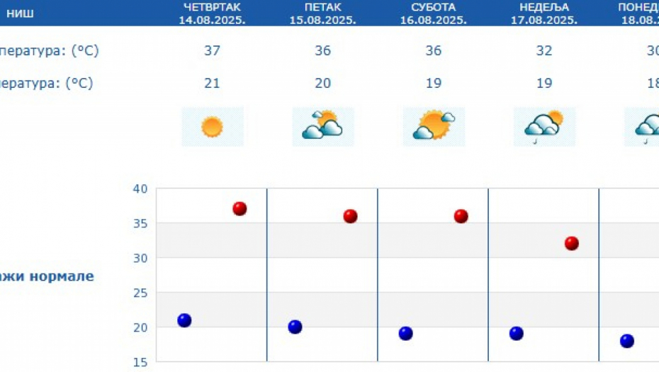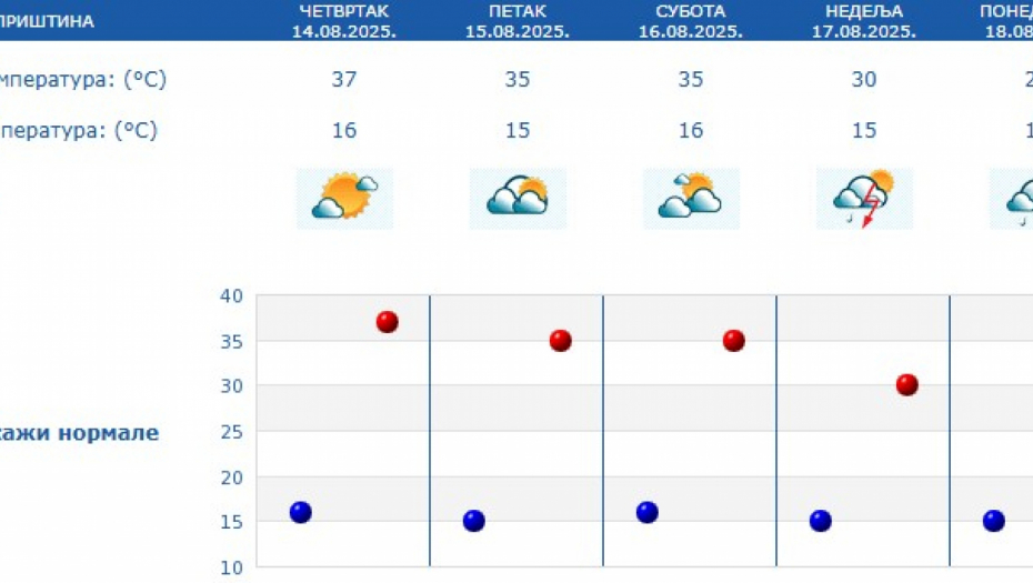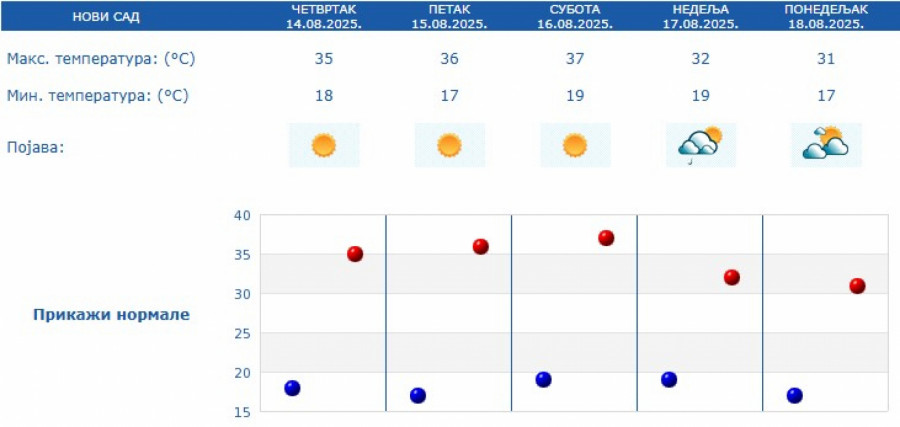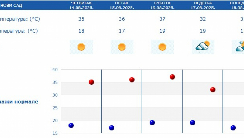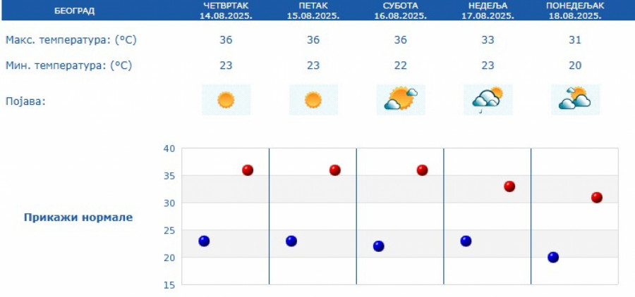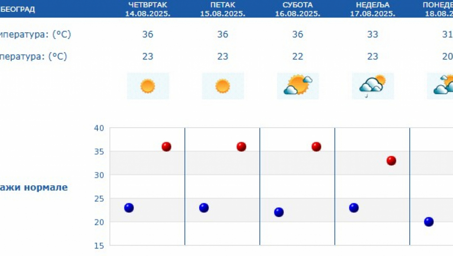 Prema prognozi za naredne dane, veoma toplo vreme zadržaće se do subote, sa temperaturama između 34 i 38 stepeni. U nedelju sledi manji pad temperature, pa će maksimalne dnevne vrednosti u većini mesta biti između 30 i 32 stepena.