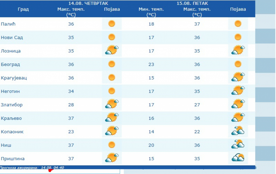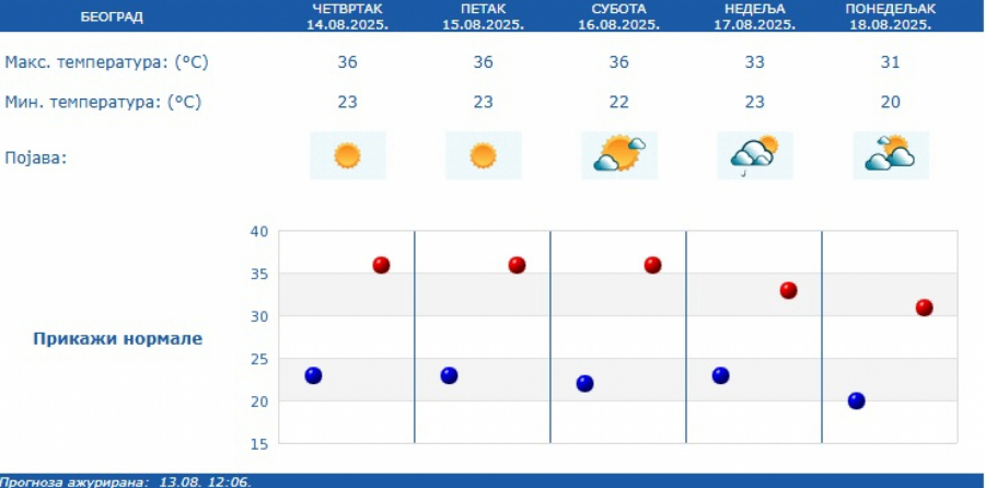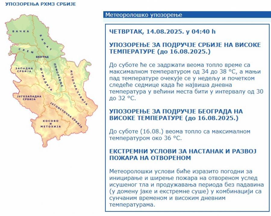 U upozorenju koje je objavio RHMZ navodi se da će se do subote 16. avgusta na području Srbije zadržati veoma toplo vreme sa maksimalnom temperaturom od 34 do 38 stepeni.