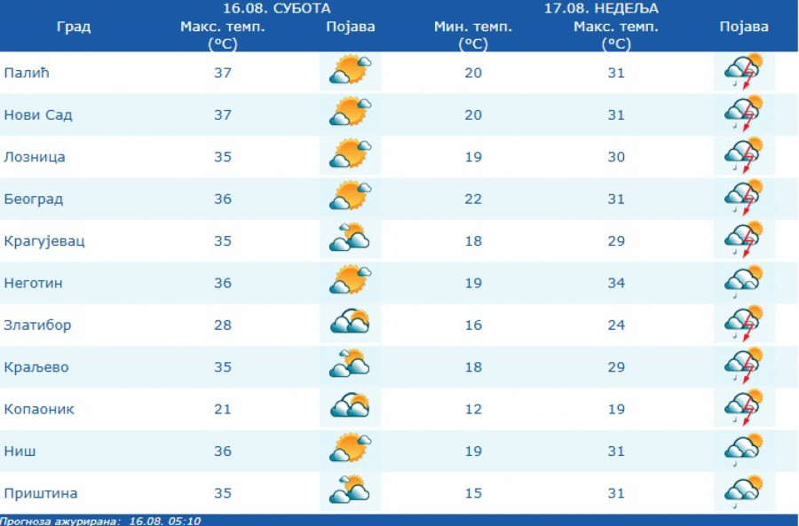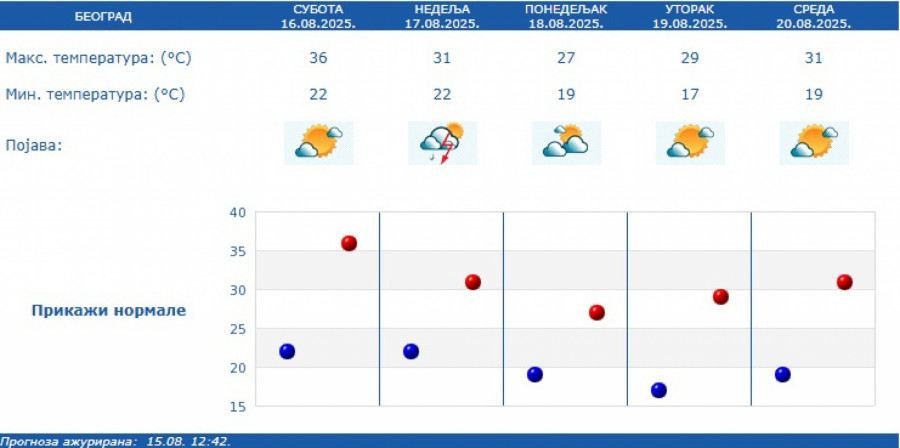 U nedelju i početkom sledeće sedmice temperatura će biti u postepenom padu, u većini mesta od 28 do 32 °C.