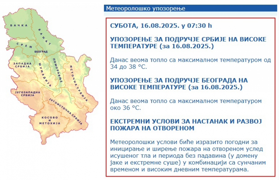Vetar će biti u skretanju na severozapadni, umeren, pre podne u Vojvodini, a potom i u ostalim predelima. Najniža temperatura od 15 do 22 stepeni, a najviša od 29 do 33 stepeni.