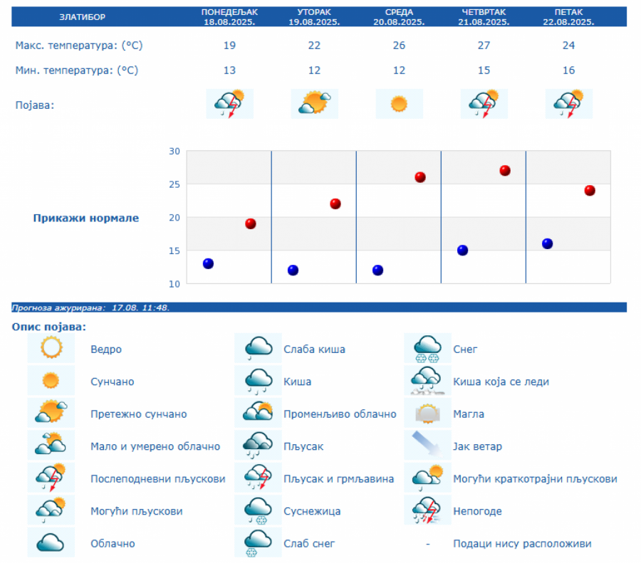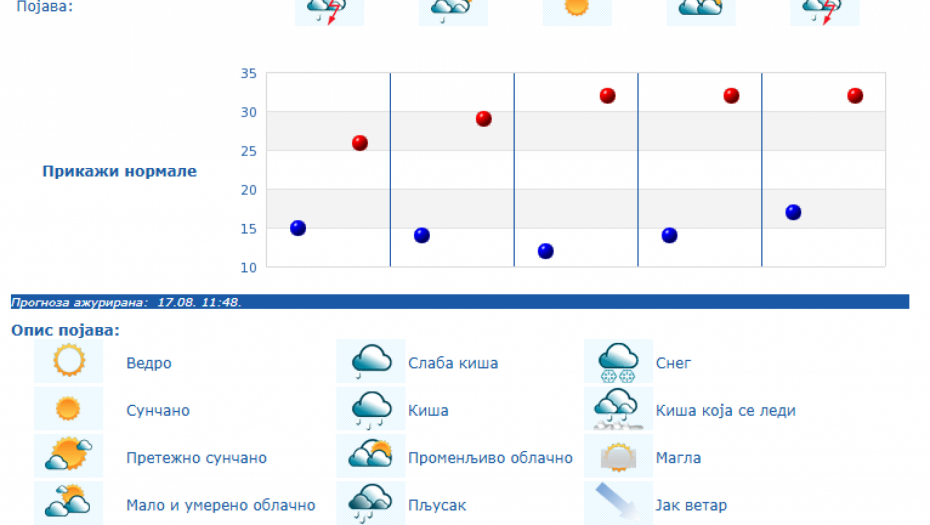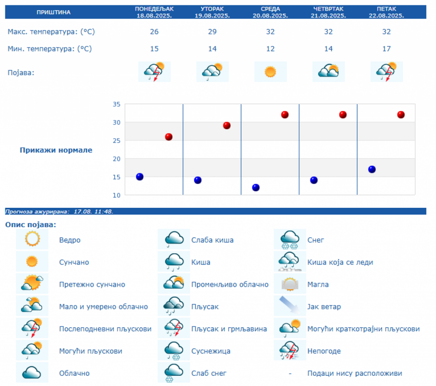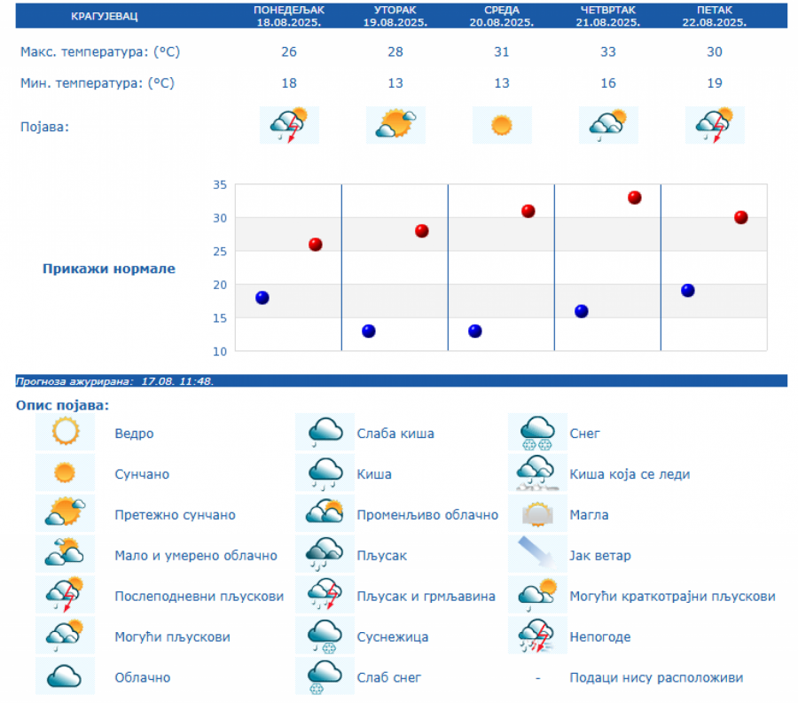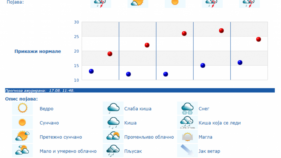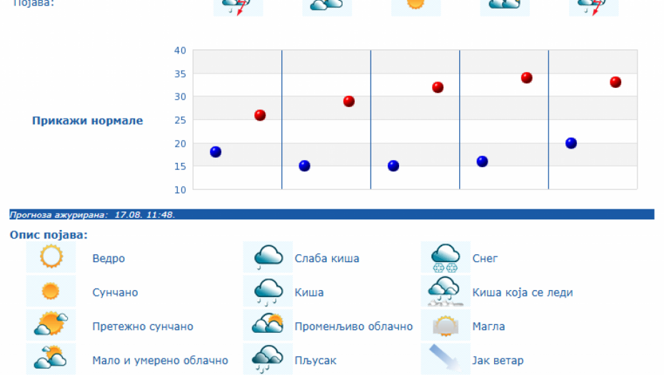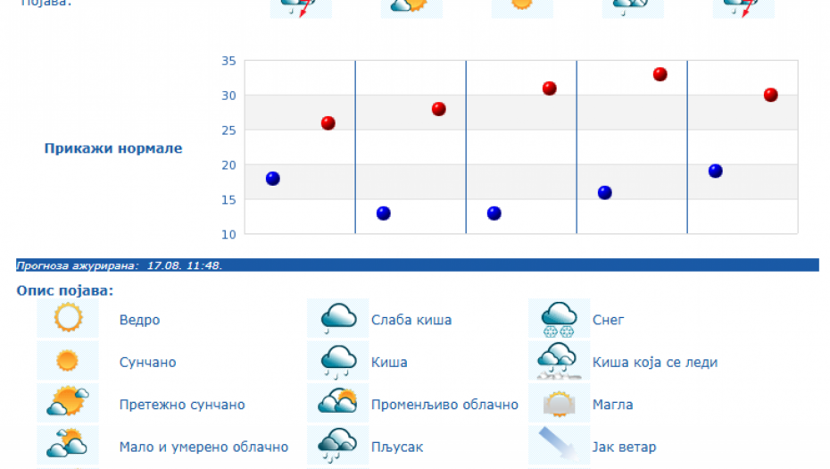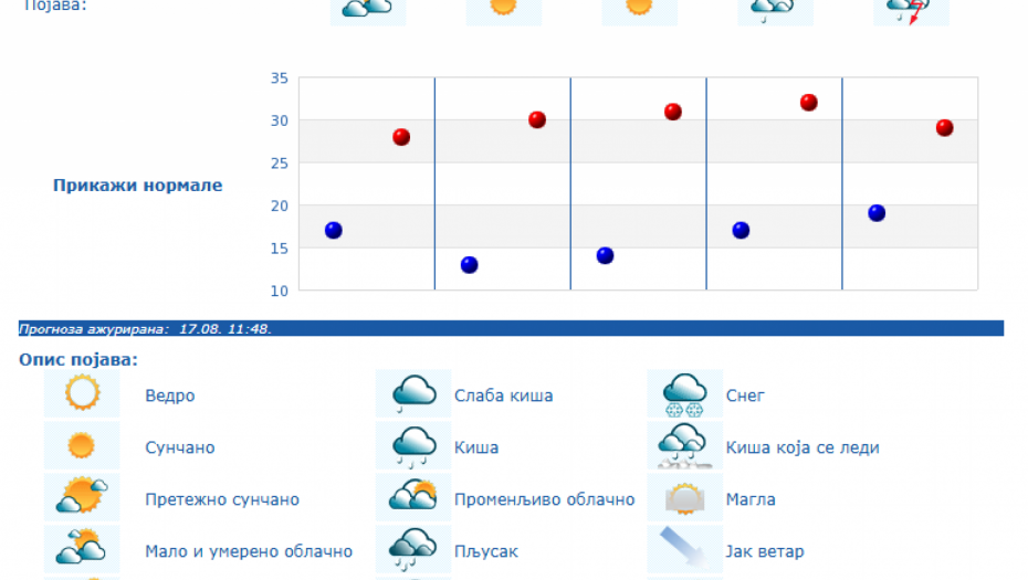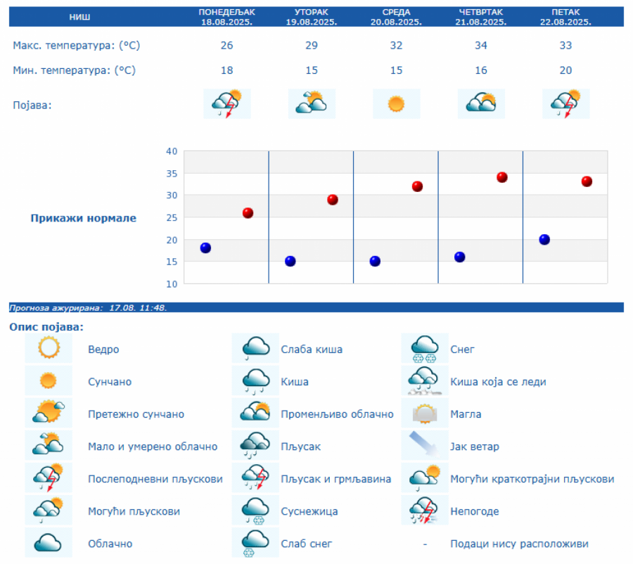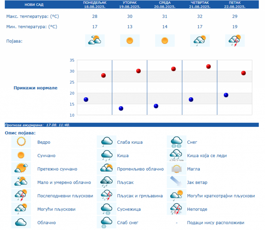 Najniža temperatura oko 18, najviša oko 27 stepeni. Prema izgledima za sedam dana, u utorak i sredu pretežno sunčano, a samo u utorak ujutro na istoku i jugoistoku uz promenljivu oblačnost, tek ponegde sa kratkotrajnom kišom.