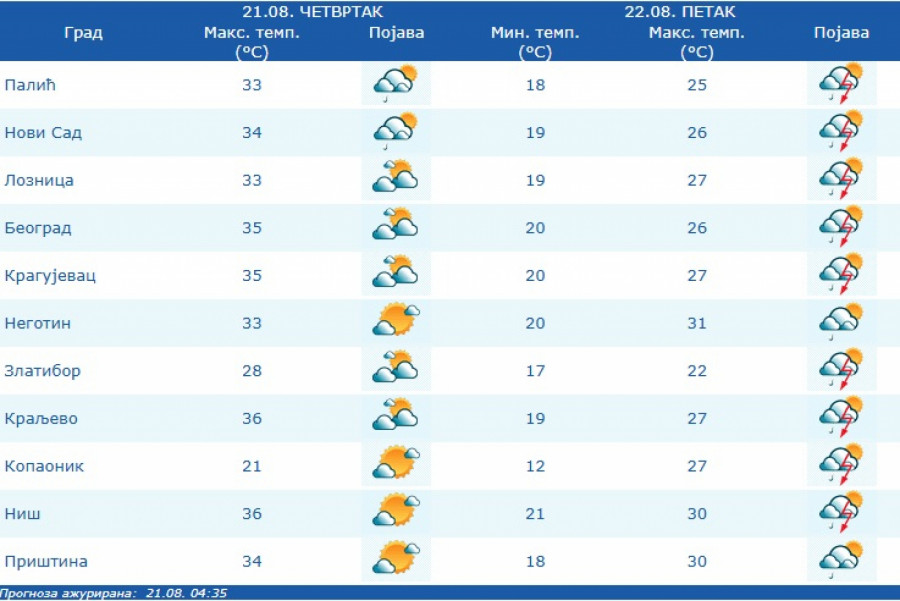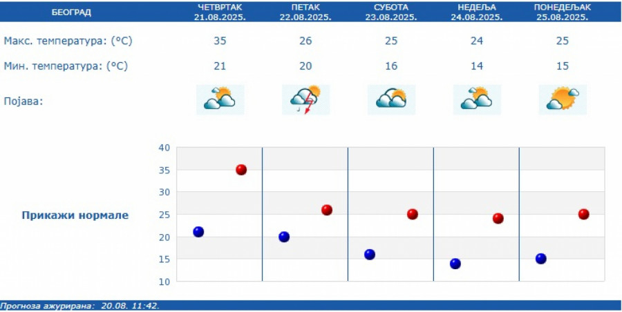 Danas se očekuje maksimalna temperatura od 33 do 38 stepeni, a najtoplije će biti na jugu i istoku Srbije.
