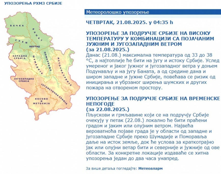 Usled umerenog i jakog južnog i jugozapadnog vetra u donjem Podunavlju i na jugu Banata, a od sredine dana i širom zapadne i južne Srbije, povećava se rizik od iniciranja i ubrzanog širenja šumskih i drugih požara na otvorenom prostoru.