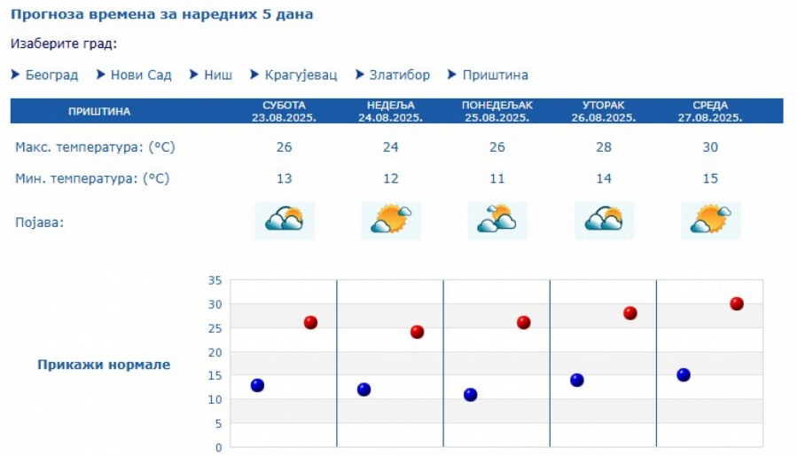 Međutim, u ponedeljak i utorak (25–26. avgust) očekuju se lokalni pljuskovi s grmljavinom na zapadu, jugozapadu i jugu zemlje, dok će sever ostati uglavnom suv.
