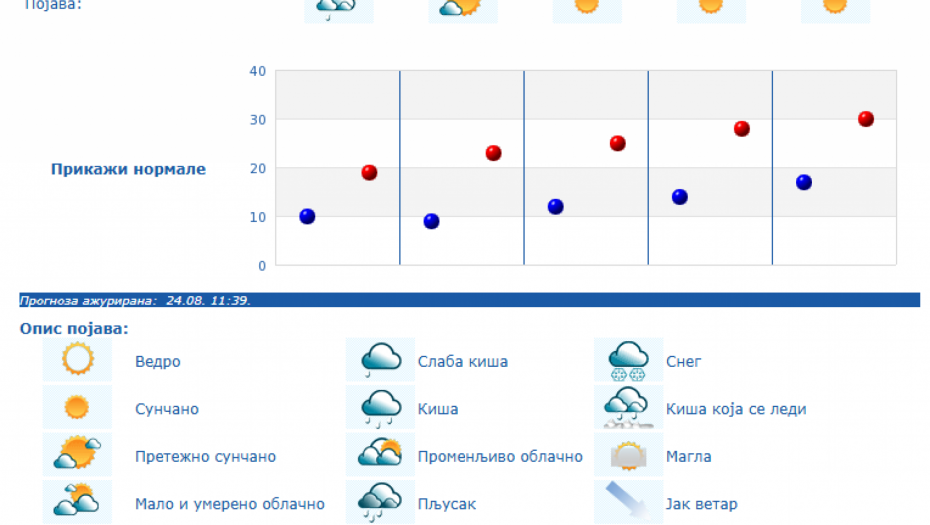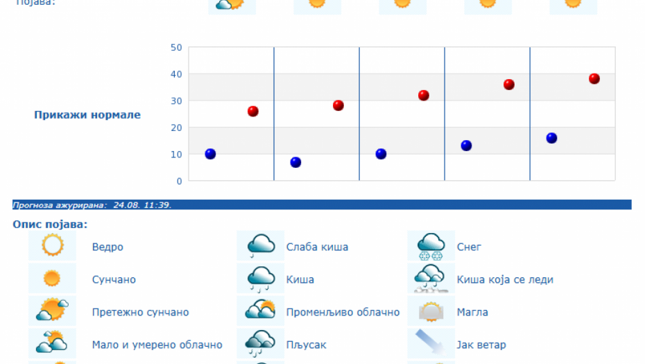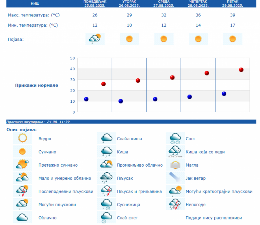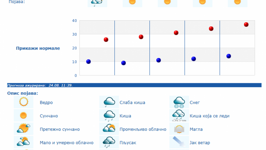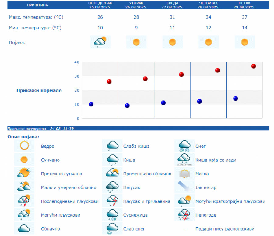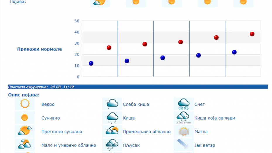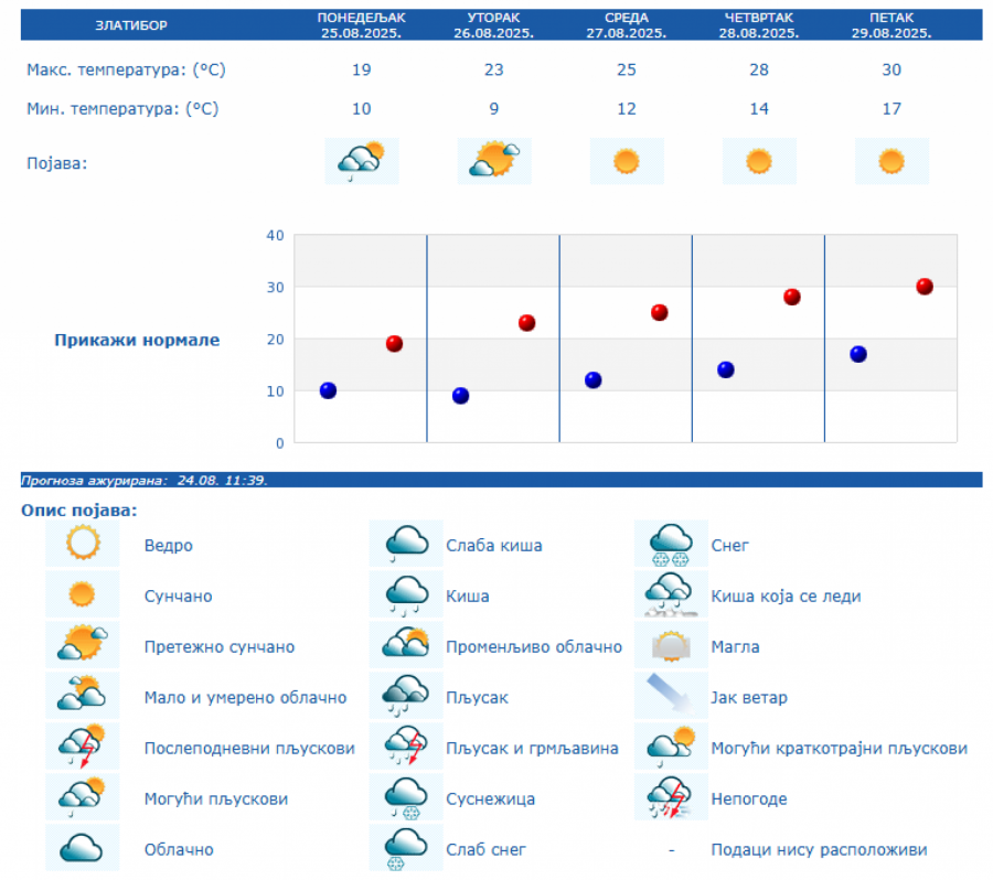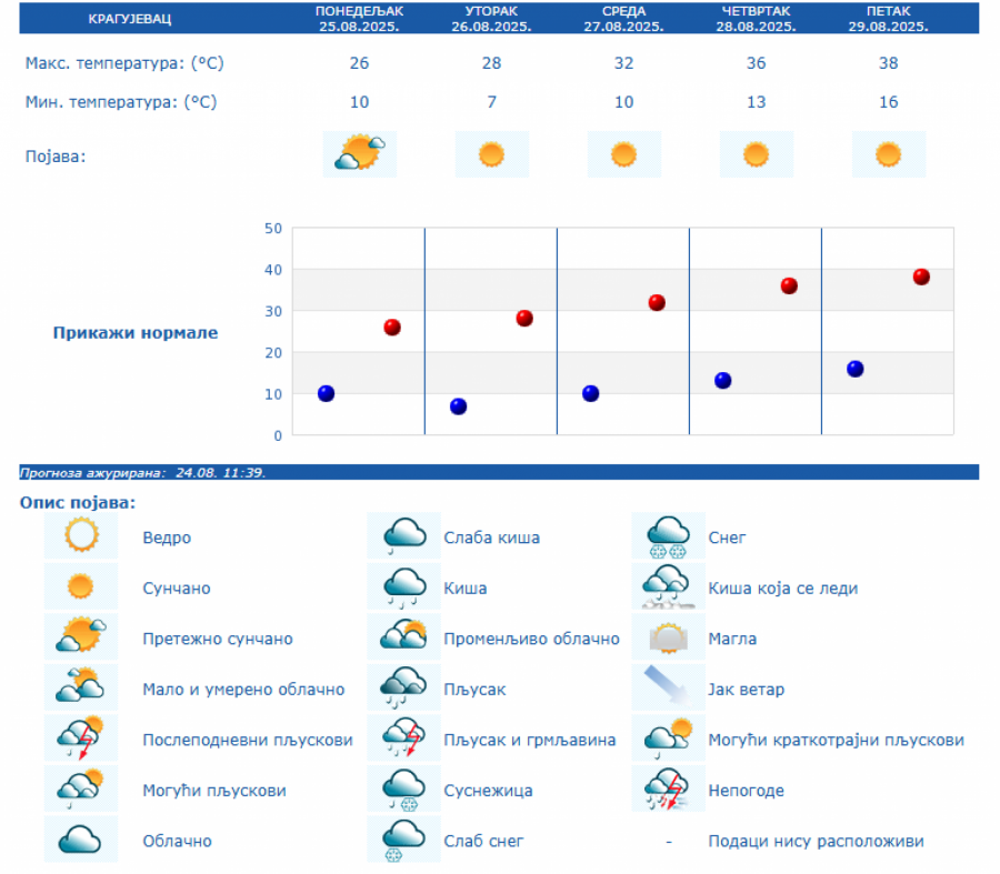 U utorak i sredu (26 - 27.08.) pretežno sunčano, povremeno uz slabu do umerenu oblačnost. Jutra će i dalje biti sveža, a dnevne temperature u postepenom porastu na vrednosti oko i malo iznad 30 stepeni.