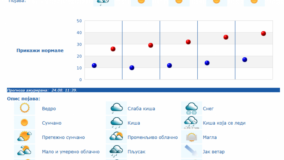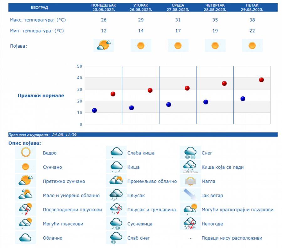 U četvrtak i petak (28 - 29.08.) sunčano i osetno toplije - u košavskom području počeće da duva umeren i jak južni i jugoistočni vetar, u petak u Banatu i donjem Podunavlju sa najjačim (olujnim) udarima, a dnevne temperature će u četvrtak najpre dostići 35 stepeni, a u petak se i približiti vrednosti od 40 stepeni.