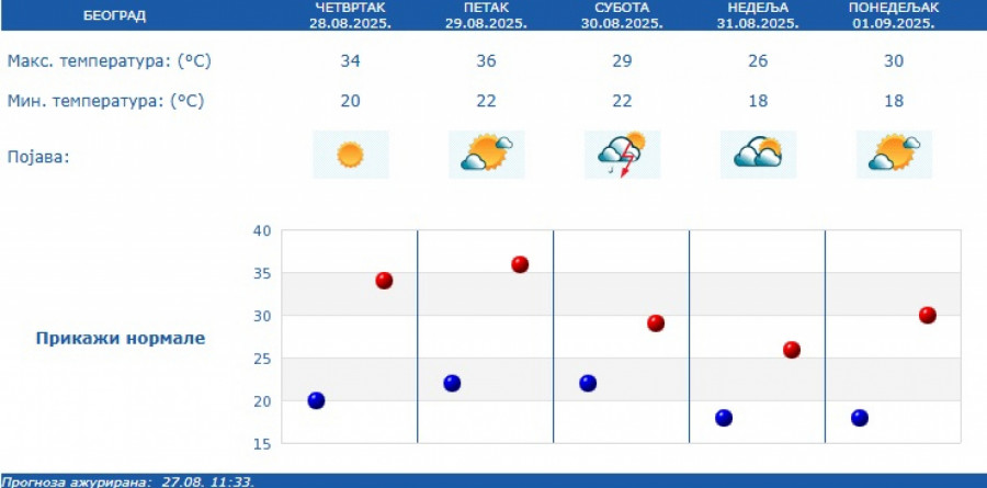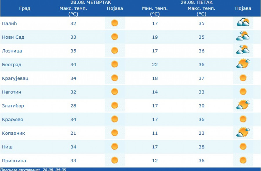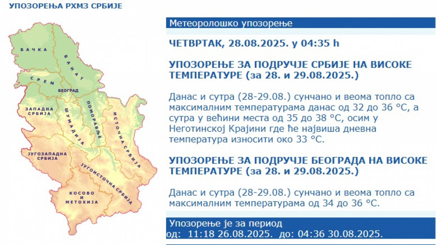 Republički hidrometeorološki zavod (RHMZ) upozorio je da Srbiju danas i sutra, 28. i 29. avgusta, očekuje pravi toplotni talas.