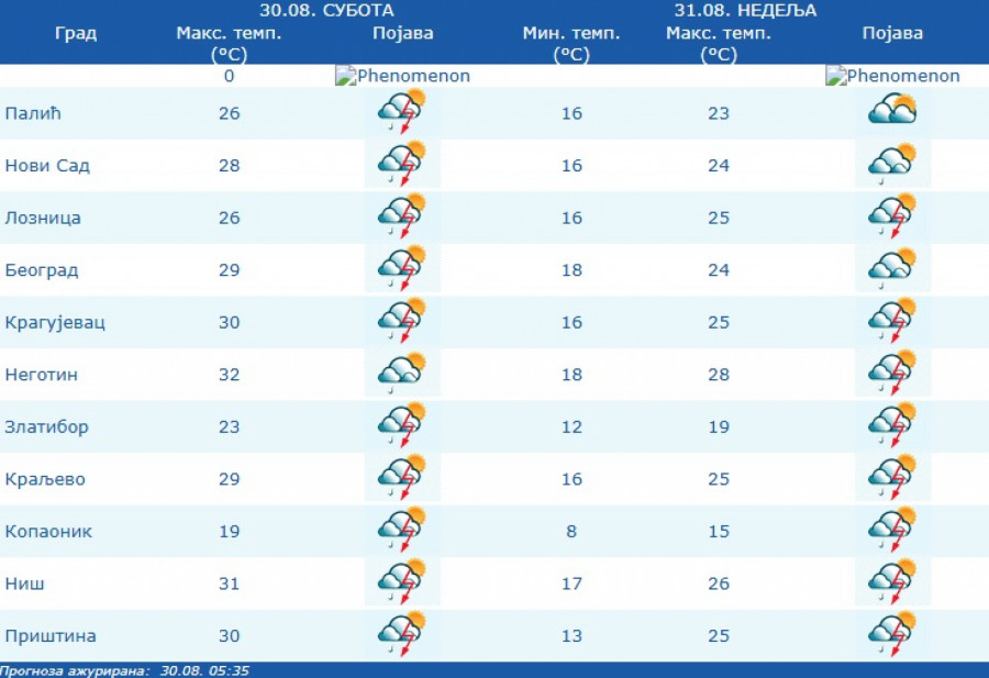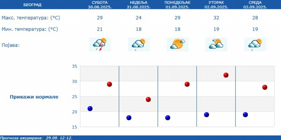U nedelju (31.08.) promenljivo oblačno, svežije i nestabilno, povremeno sa kišom i lokalnim pljuskovima sa grmljavinom koji će lokalno usloviti i veliku količinu padavina za kratko vreme.