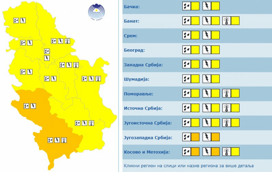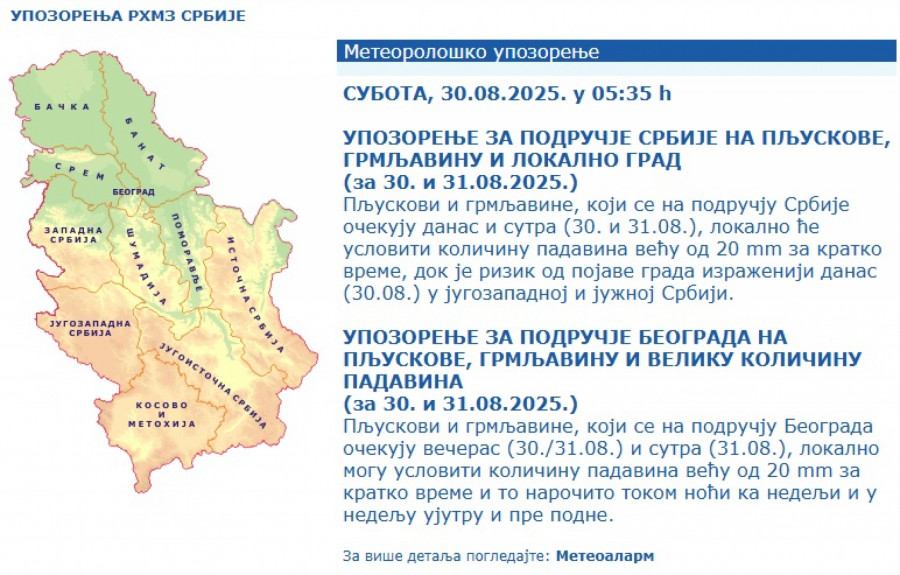 Pljuskovi i grmljavine, koji se na području Srbije očekuju danas i sutra (30. i 31. avgusta), lokalno će usloviti količinu padavina veću od 20 mm za kratko vreme, dok je rizik od pojave grada izraženiji danas u jugozapadnoj i južnoj Srbiji.
