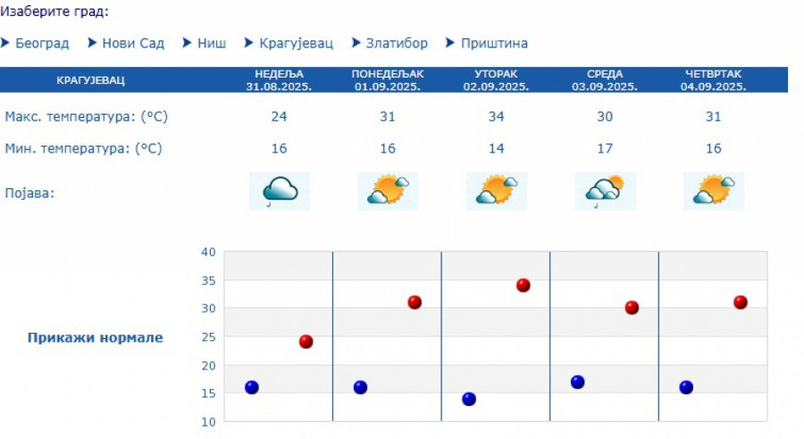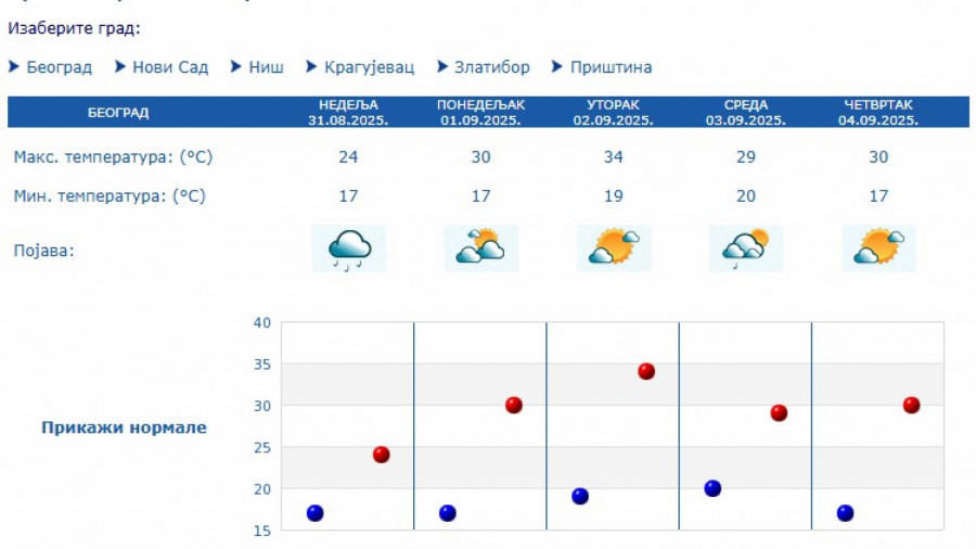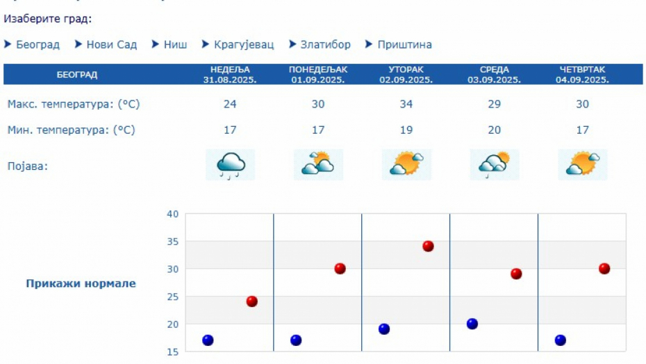 Najniža temperatura biće oko 17 stepeni, a najviša oko 24.