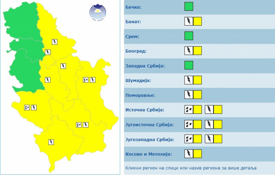 U većem delu Srbije na snazi je žuti meteoalarm za pljuskove sa grmljavinom, osim u Sremu, Bačkoj i Zapadnoj Srbiji.
