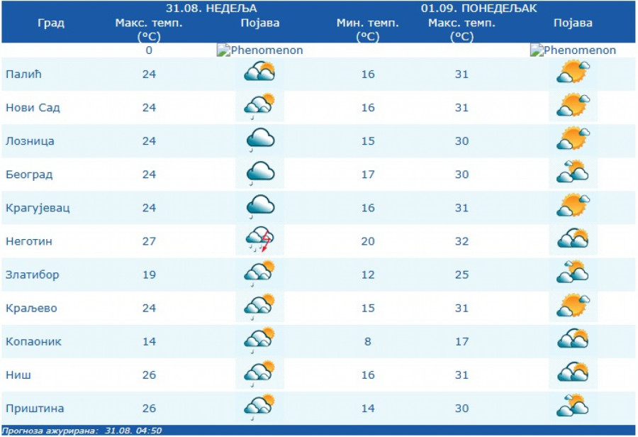 Vreme danas (31.08.) promenljivo oblačno i svežije, mestimično sa kišom i lokalnim pljuskovima sa grmljavinom koji ponegde mogu biti izraženiji.