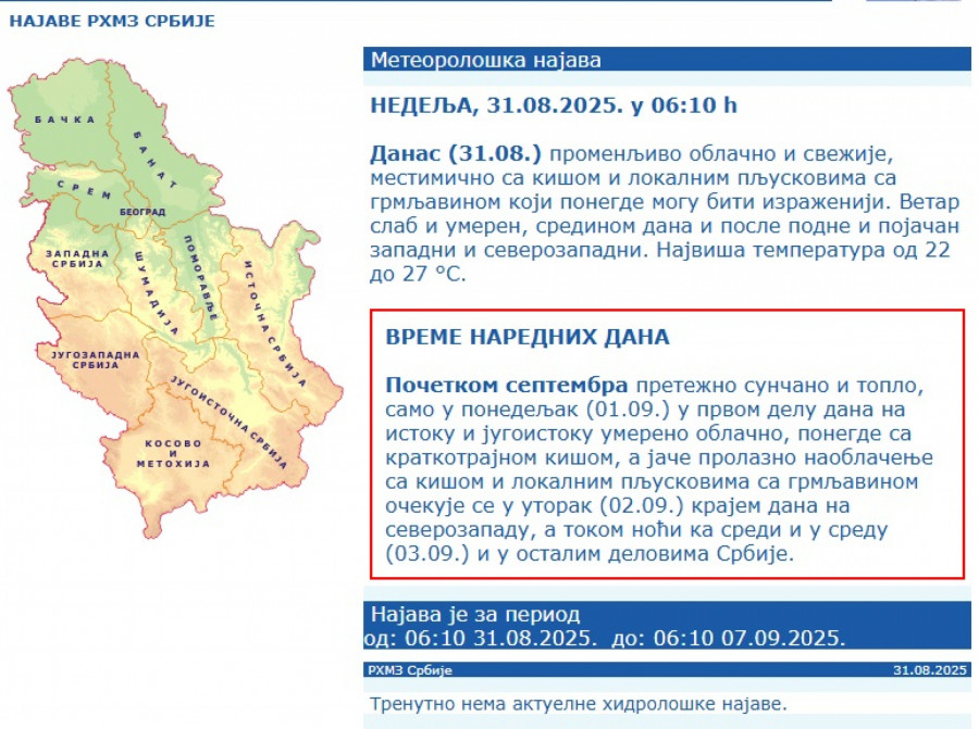 Početkom septembra pretežno sunčano i toplo, samo u ponedeljak (01.09.) u prvom delu dana na istoku i jugoistoku umereno oblačno, ponegde sa kratkotrajnom kišom.