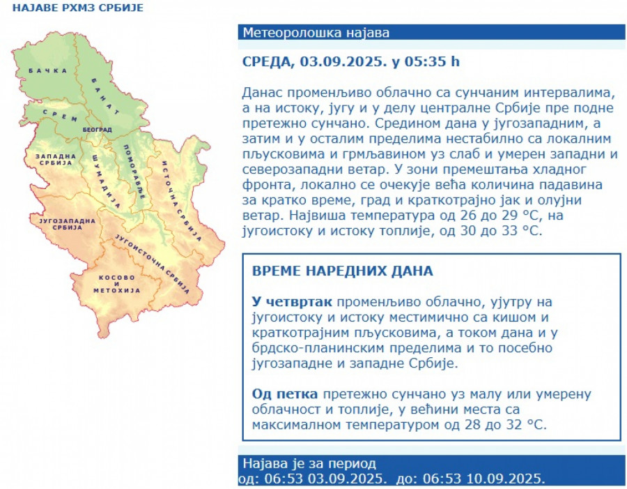 U zoni premeštanja hladnog fronta preko našeg područja, lokalno se očekuje veća količina padavina za kratko vreme, grad i kratkotrajno jak i olujni vetar.