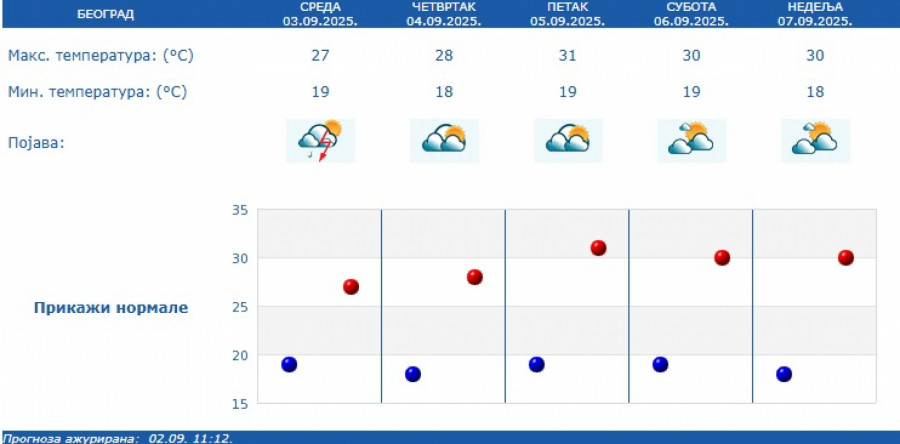 Ujutru temperatura od 12 do 19, tokom dana u većini mesta od 24 stepena do 29 stepeni, na istoku i jugoistoku nešto toplije, do 32 stepena.