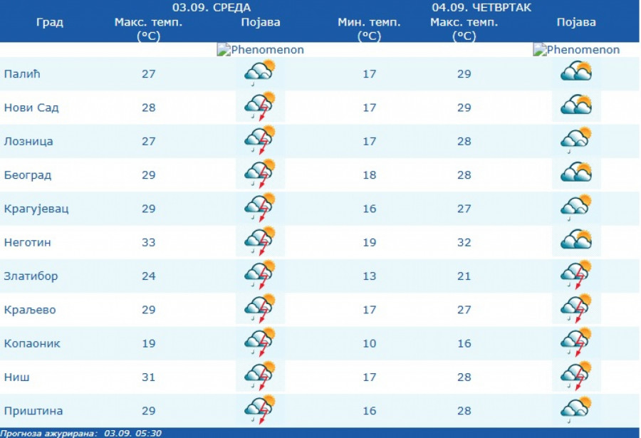 Pre podne će biti pretežno sunčano uz malu ili umerenu oblačnost. Posle podne promenljivo oblačno i nestabilno, s lokalnim pljuskovima i grmljavinom.