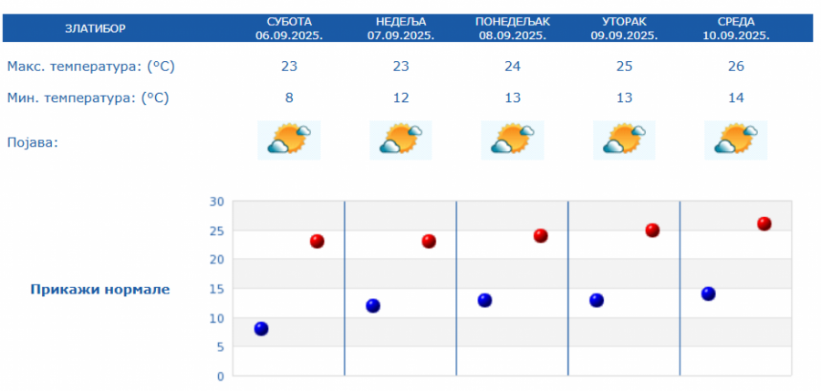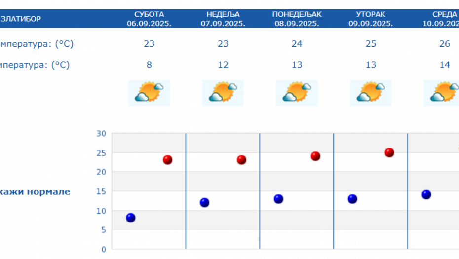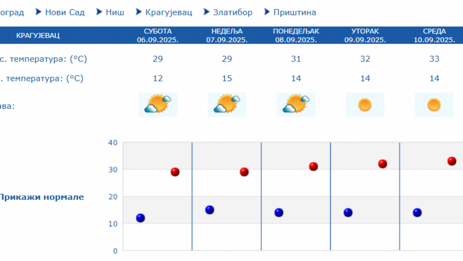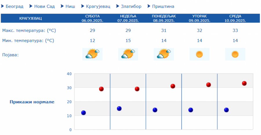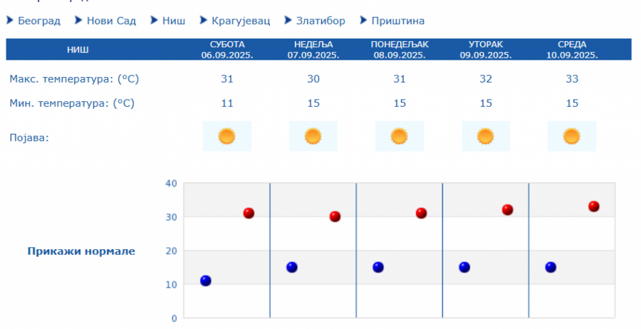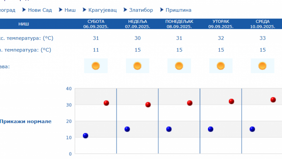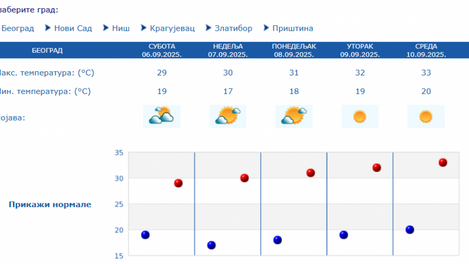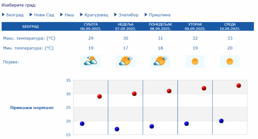 Prema izgledima vremena u Srbiji za narednih sedam dana, do 13. septembra, očekuje se pretežno sunčano i toplo vreme, u većini mesta sa najvišom dnevnom temperaturom od 30 do 33 stepena.