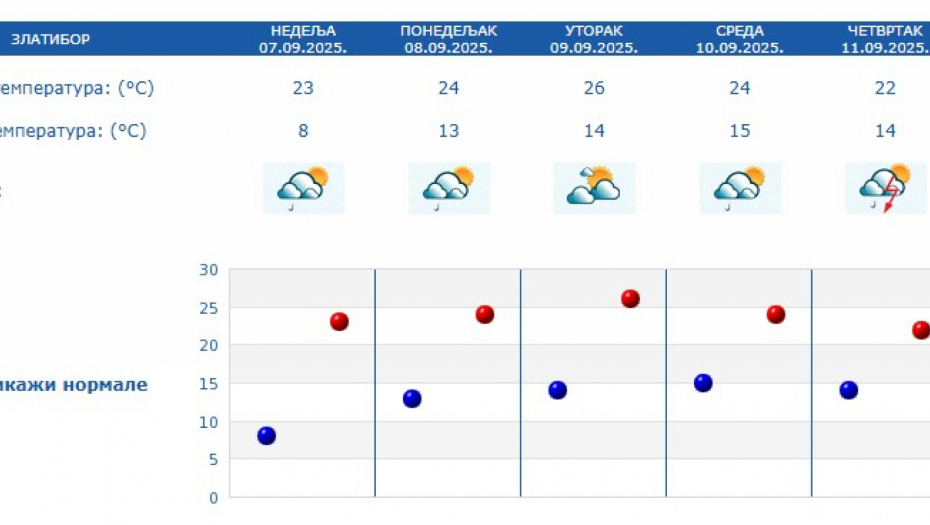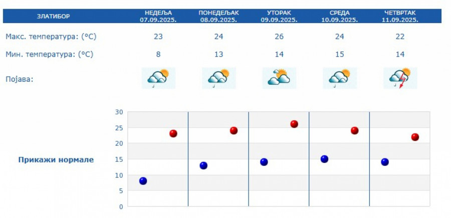 Prema prognozi Republičkog hidrometeorološkog zavoda, umerena oblačnost će posle podne u planinskim predelima usloviti retku pojavu kratkotrajne kiše ili pljuska uz mogućnost grmljavine. Duvaće slab i umeren severni i severozapadni vetar.