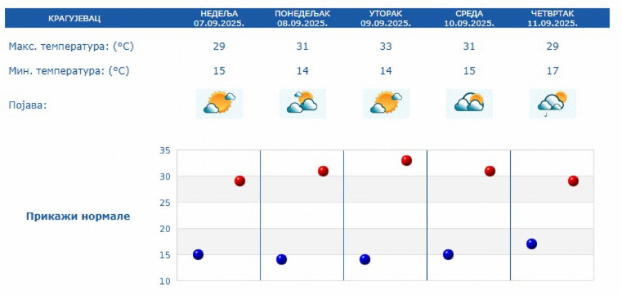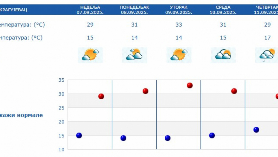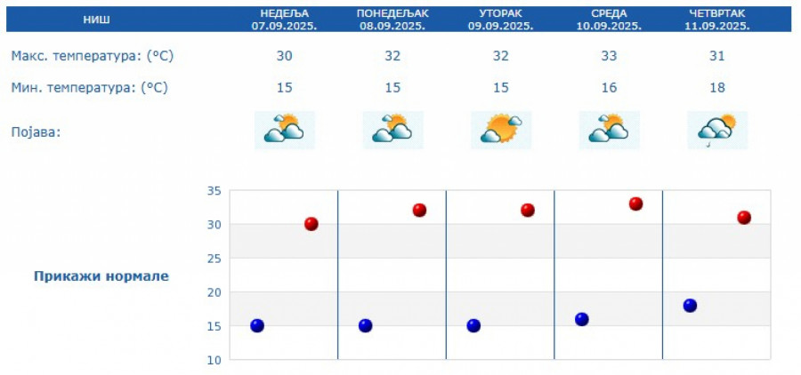 Biće i natprosečno toplo vreme sa temperaturama u većini mesta od 30 do 34 stepena, a uz lokalni razvoj oblačnosti moguća je veoma retka pojava kratkotrajne kiše ili pljuska u planinskim predelima.