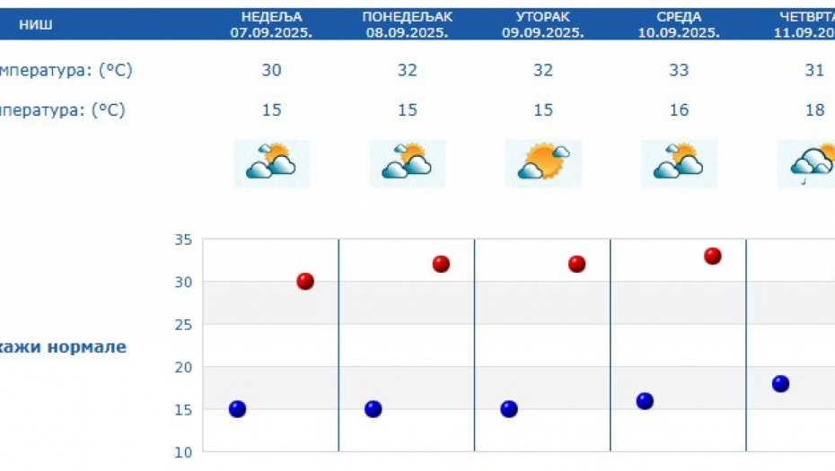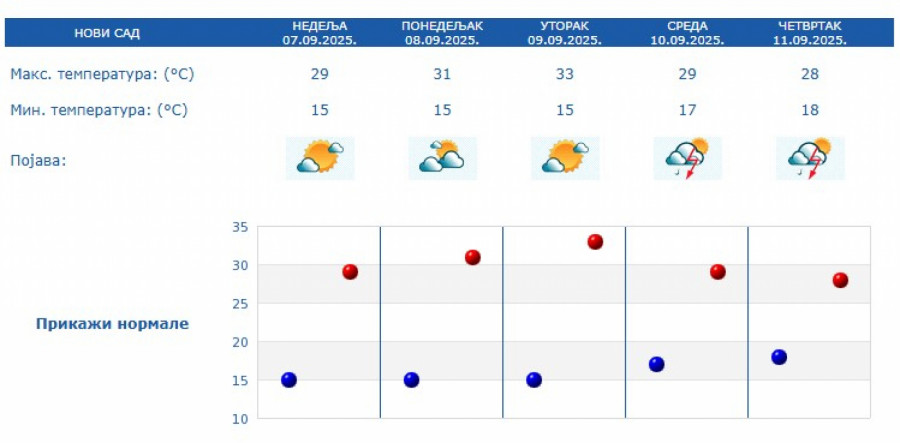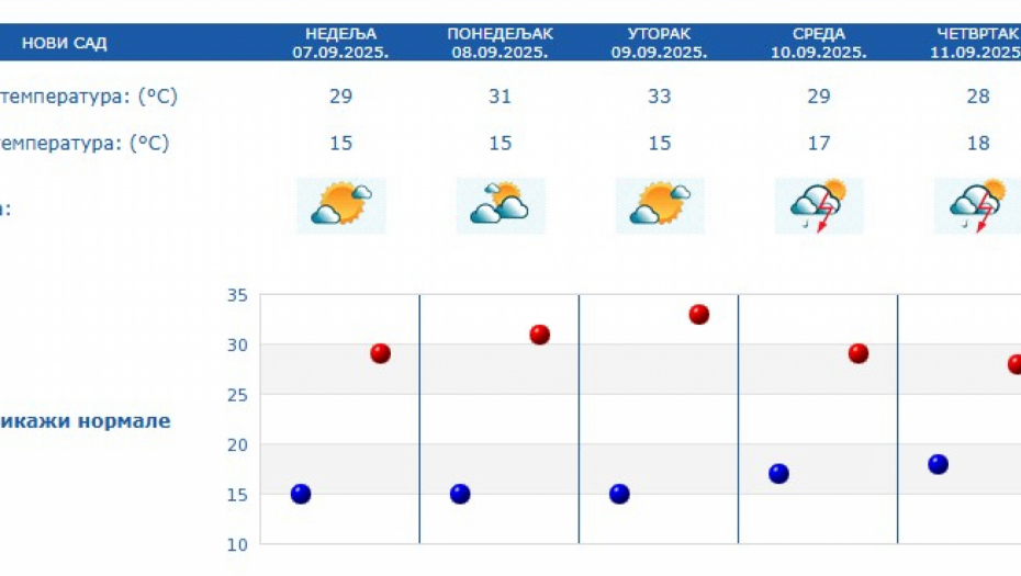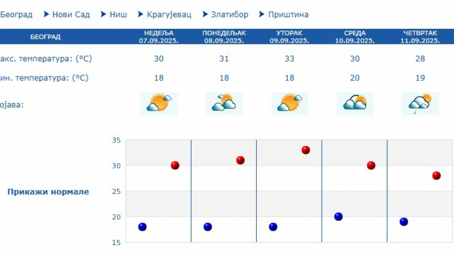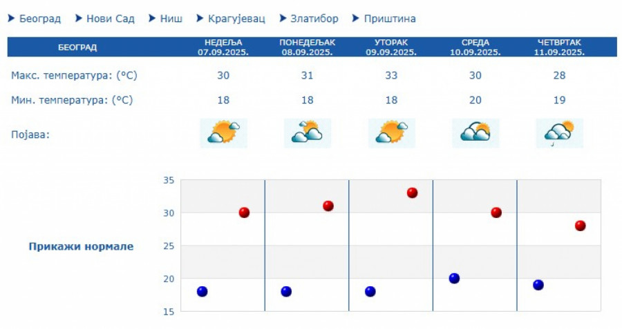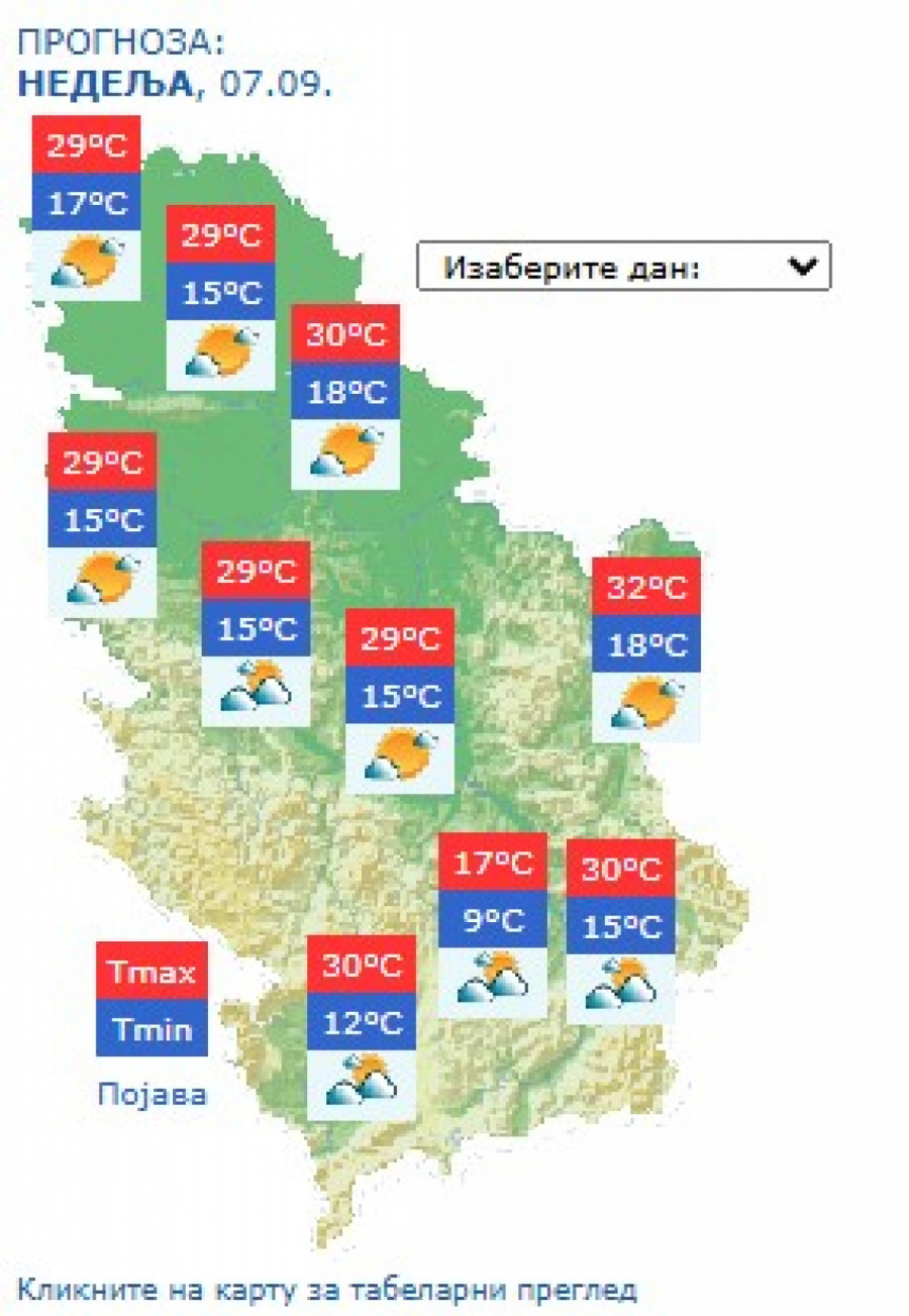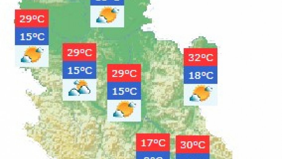 Jutarnja temperatura iznosiće od 8 do 18, najviša dnevna od 28 stepeni na severozapadu, do 33 na istoku Srbije.