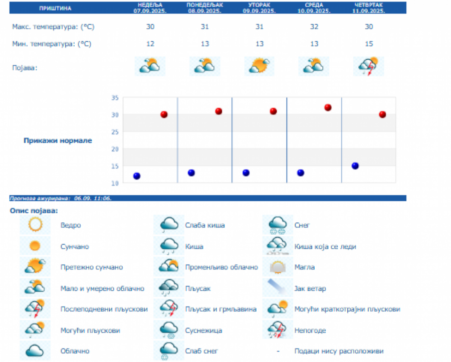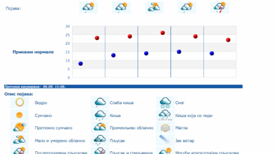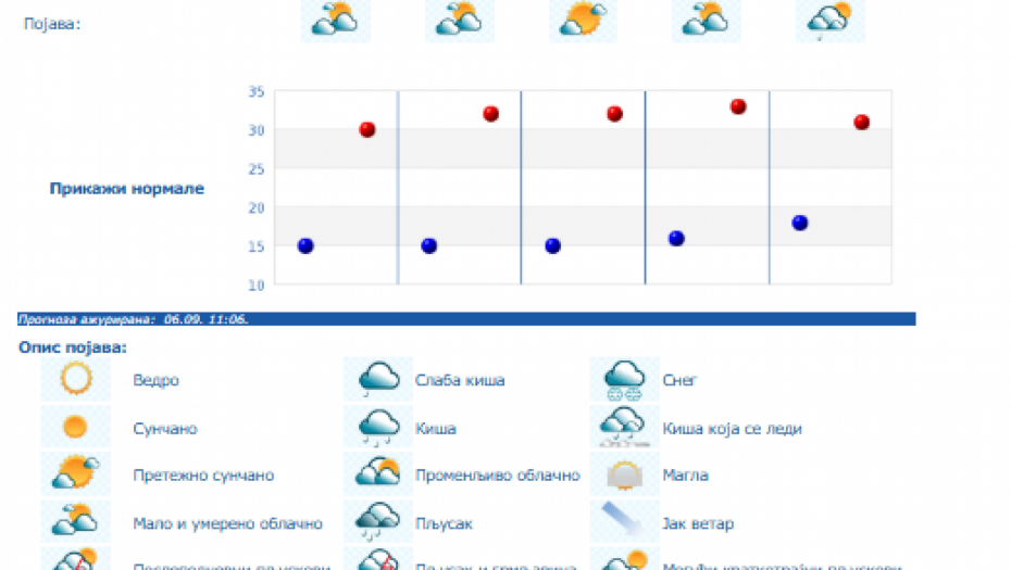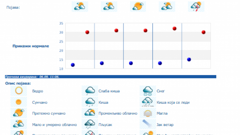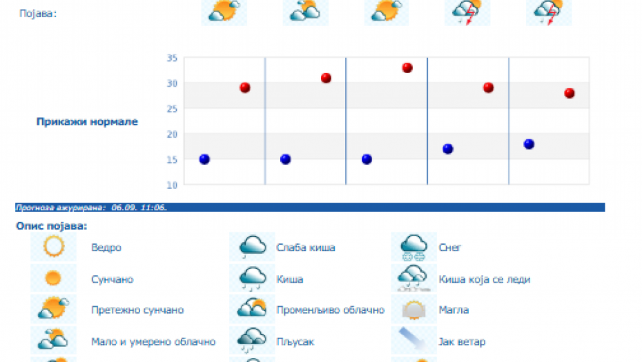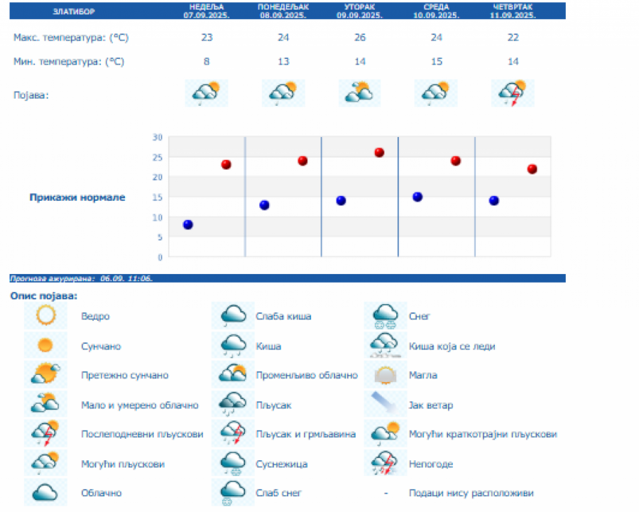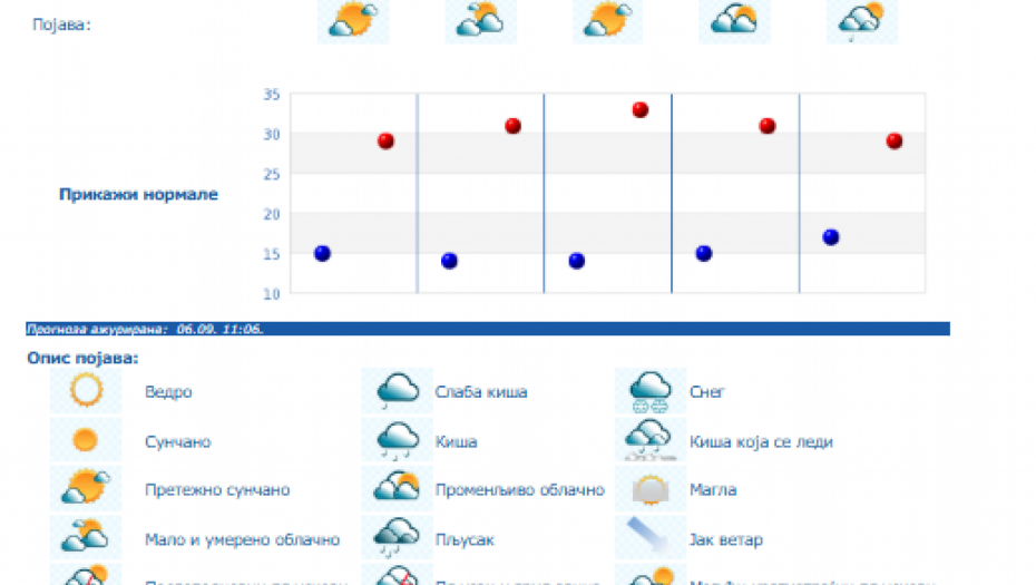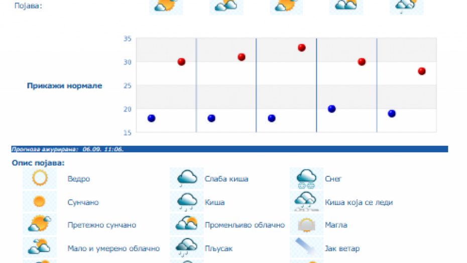 Prema prognozi Republičkog hidrometeorološkog zavoda, umerena oblačnost će posle podne u planinskim predelima usloviti retku pojavu kratkotrajne kiše ili pljuska uz mogućnost grmljavine. Duvaće slab i umeren severni i severozapadni vetar.