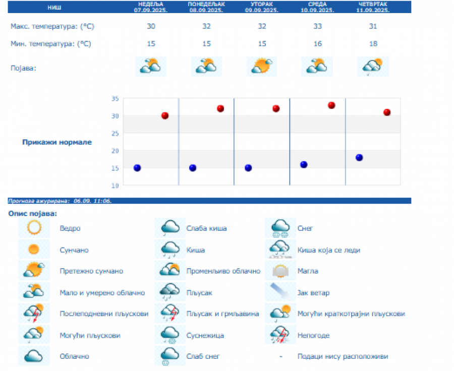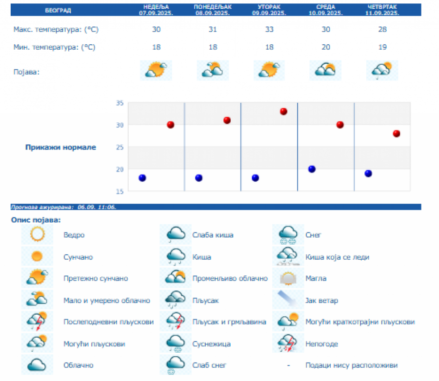 Jutarnja temperatura iznosiće od 8 do 18, najviša dnevna od 28 stepeni na severozapadu, do 33 na istoku Srbije.