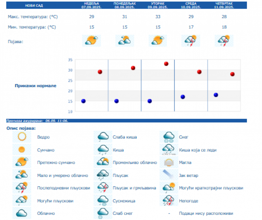 Prema izgledima vremena za narednih sedam dana, do nedelje, 14. septembra, u ponedeljak i utorak biće pretežno sunčano, povremeno uz slabu do umerenu oblačnost.