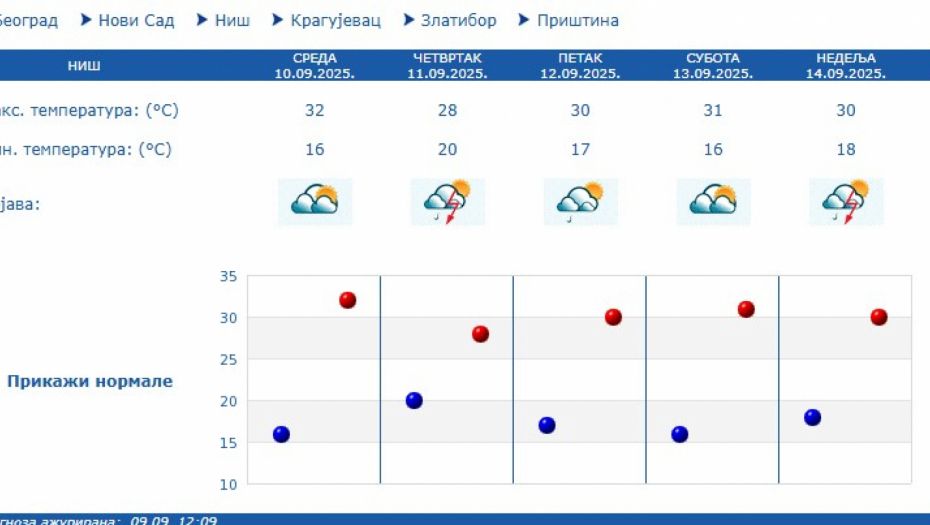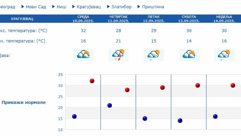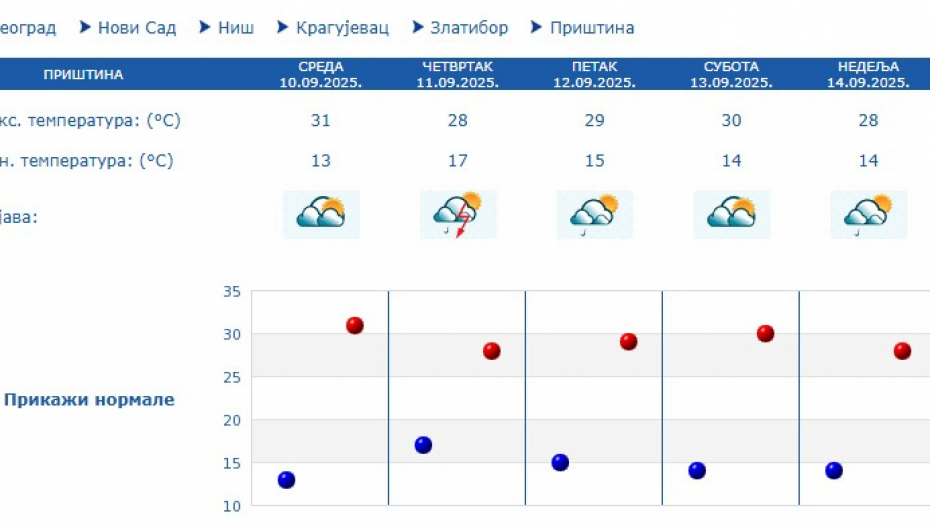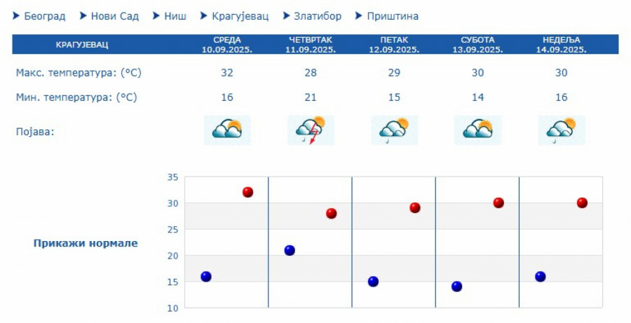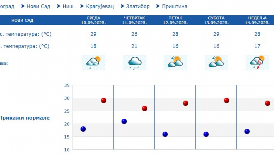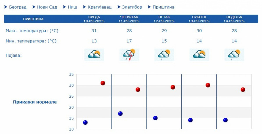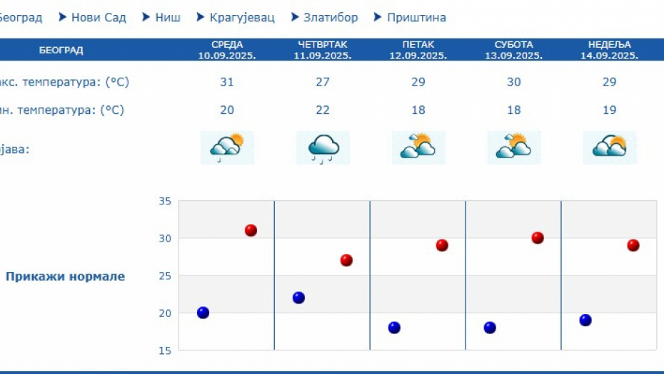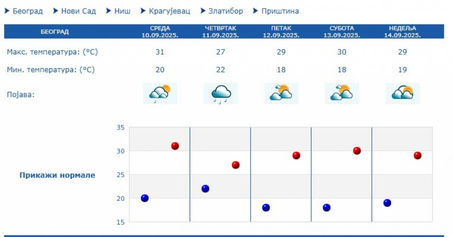 Najniža temperatura biće od 18 do 20 stepeni, a najviša dnevna oko 31.