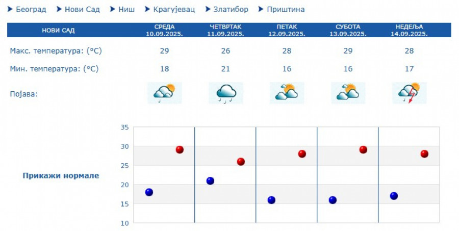 Do nedelje se očekuje promenljivo oblačno, toplo i nestabilno vreme sa lokalnom pojavom kiše i pljuskova sa grmljavinom, a samo još u četvrtak u košavskom području i vetrovito sa umerenim i jakim, na jugu Banata i u donjem Podunavlju i olujnim jugoistočnim vetrom.