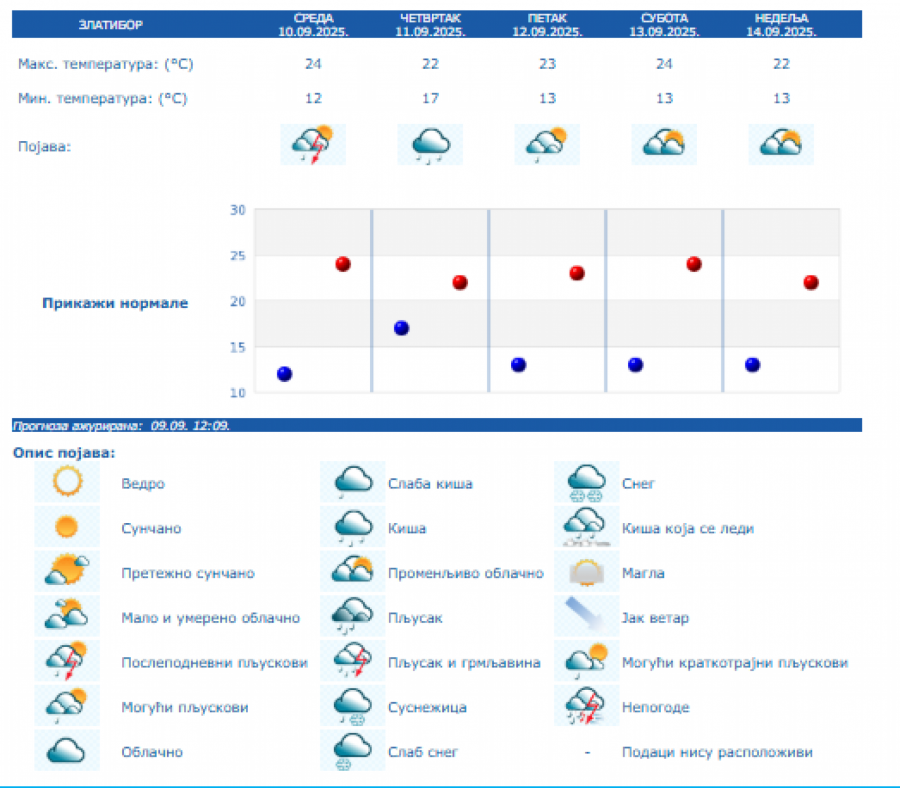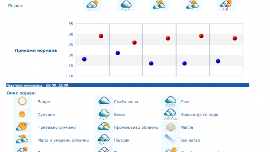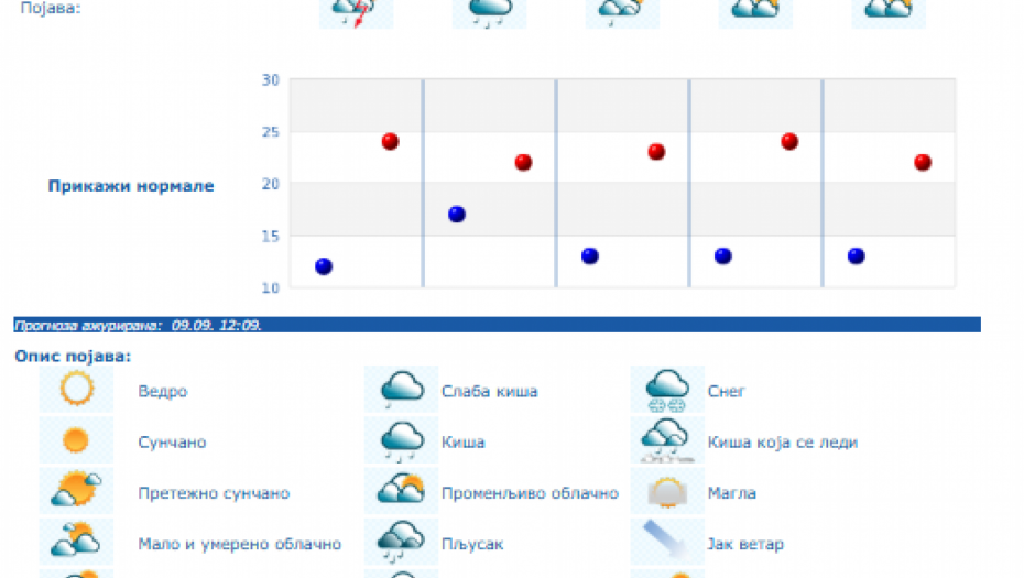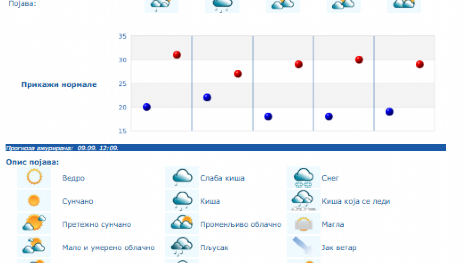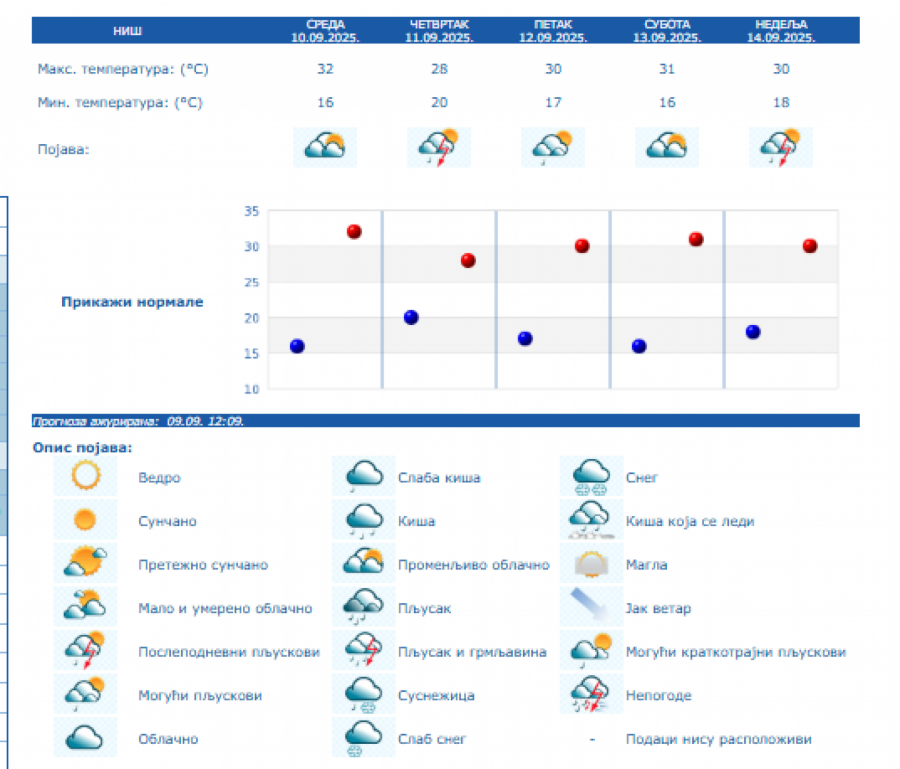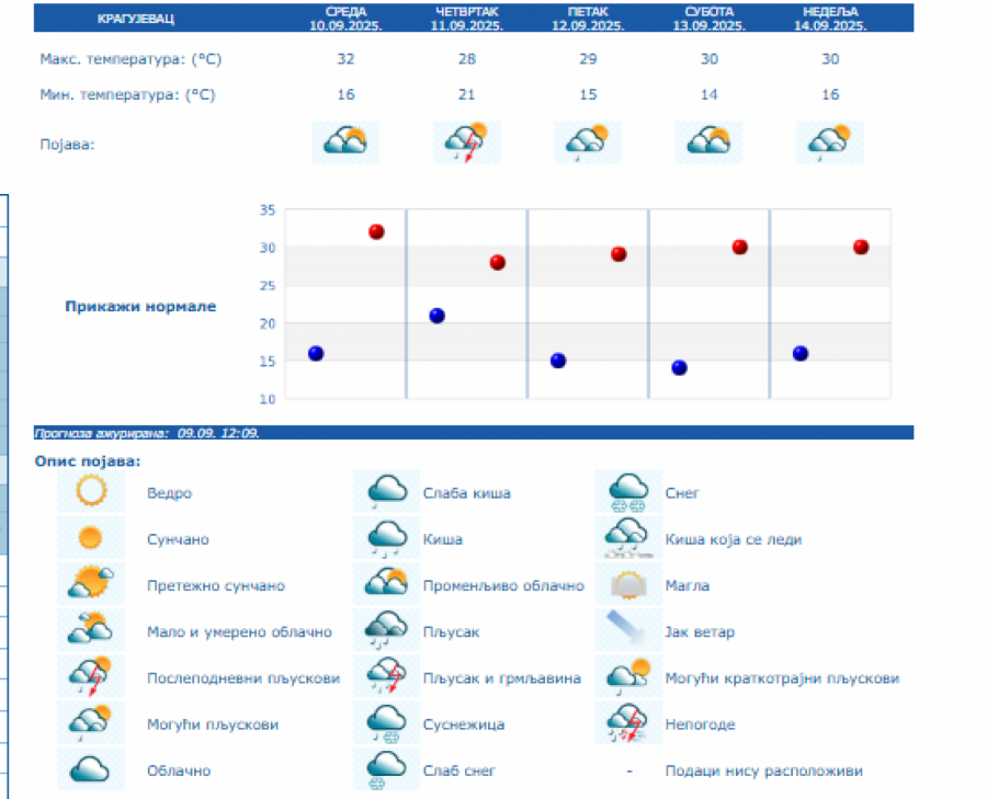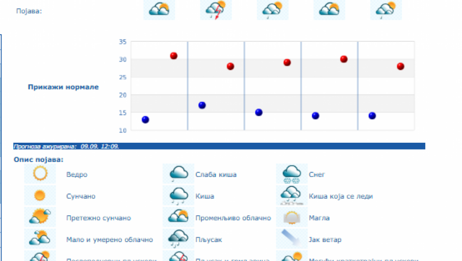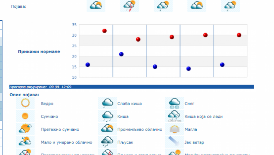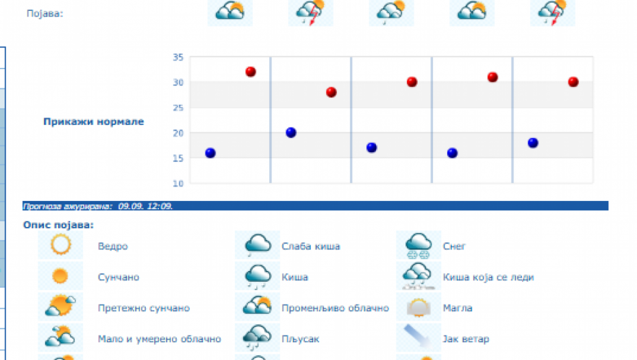 Do nedelje se očekuje promenljivo oblačno, toplo i nestabilno vreme sa lokalnom pojavom kiše i pljuskova sa grmljavinom, a samo još u četvrtak u košavskom području i vetrovito sa umerenim i jakim, na jugu Banata i u donjem Podunavlju i olujnim jugoistočnim vetrom.