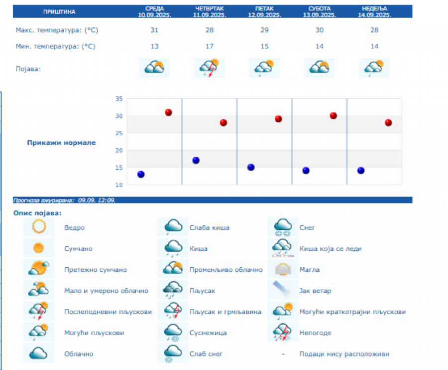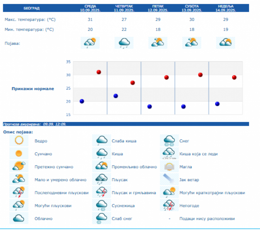 U Beogradu će biti promenljivo oblačno i toplo vreme. Kasno posle podne, uveče i tokom noći očekuje se povremeno kiša, pljuskovi i grmljavina. Duvaće slab i umeren, jugoistočni vetar, posle podne i uveče u pojačanju. Najniža temperatura biće od 18 do 20 stepeni, a najviša dnevna oko 31.