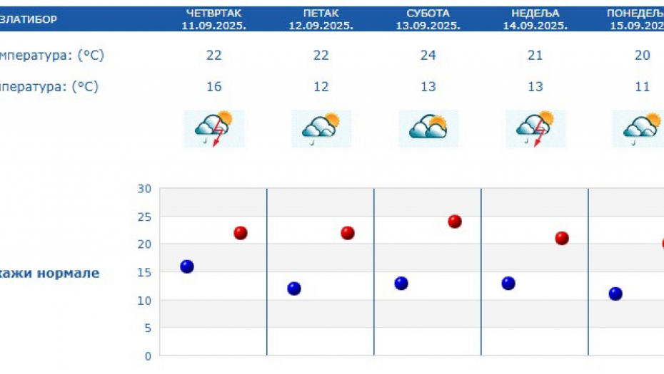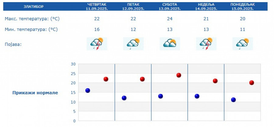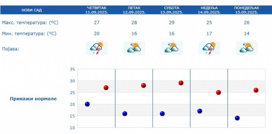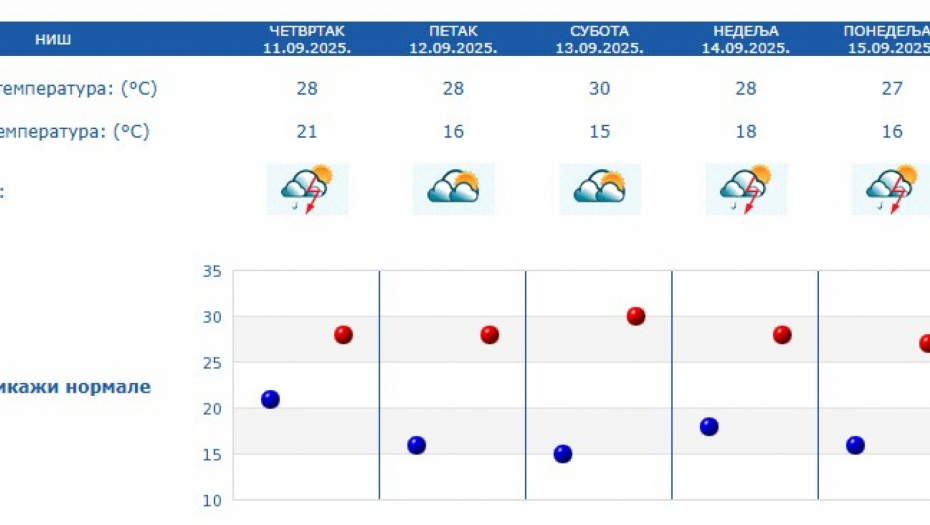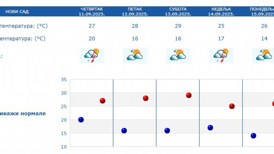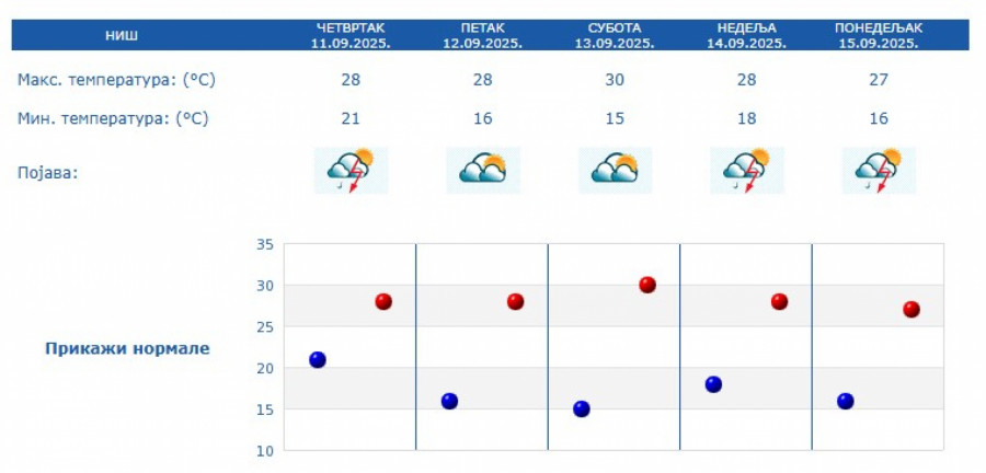 Do nedelje se očekuje promenljivo oblačno, toplo i nestabilno vreme sa lokalnom pojavom kiše i pljuskova sa grmljavinom, a samo još u četvrtak u košavskom području i vetrovito sa umerenim i jakim, na jugu Banata i u donjem Podunavlju i olujnim jugoistočnim vetrom.