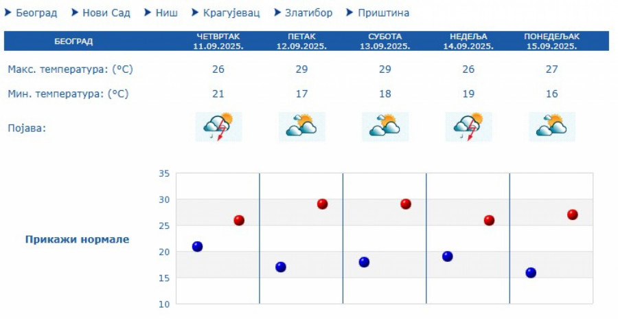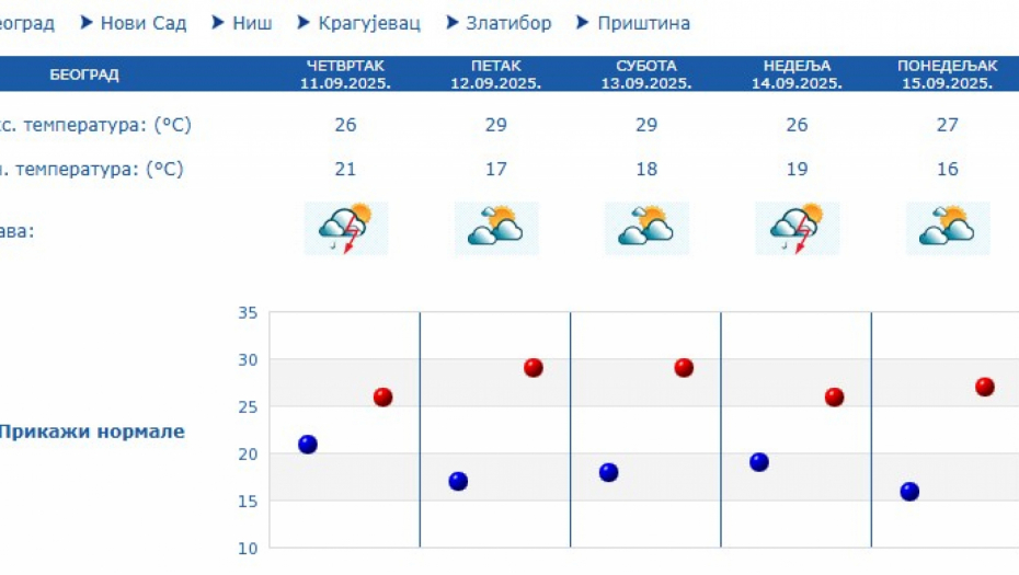 Kasnije posle podne i uveče povećanje nestabilnosti, pa se pojava kiše i pljuskova sa grmljavinom ponovo očekuje u Vojvodini, na jugozapadu i zapadu Srbije, dok se u toku noći lokalne padavine prognoziraju i u centralnim krajevima.