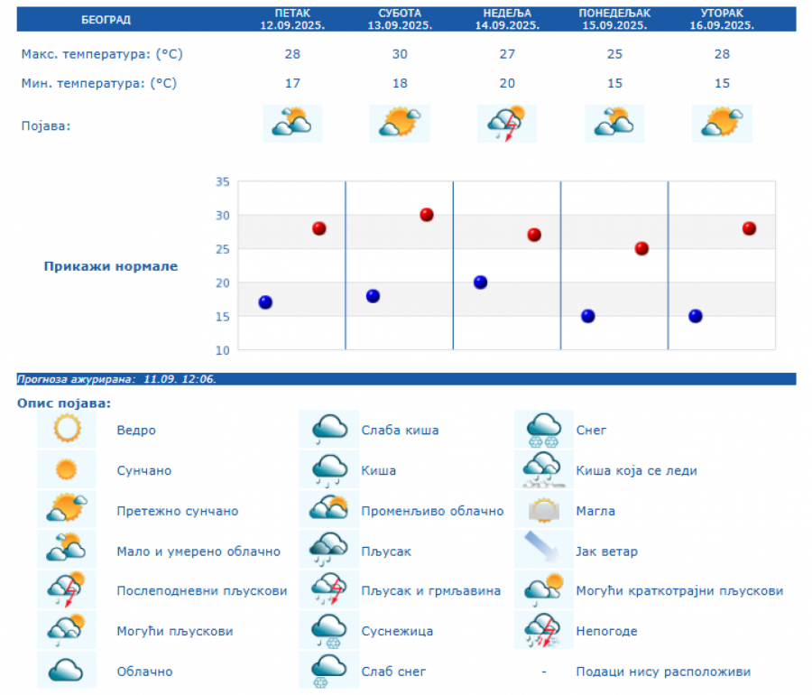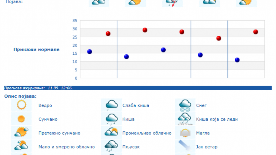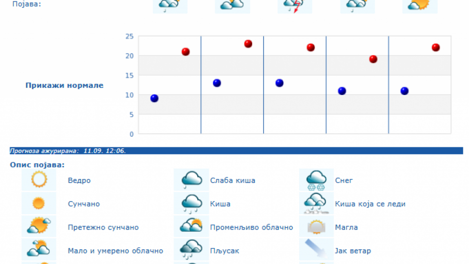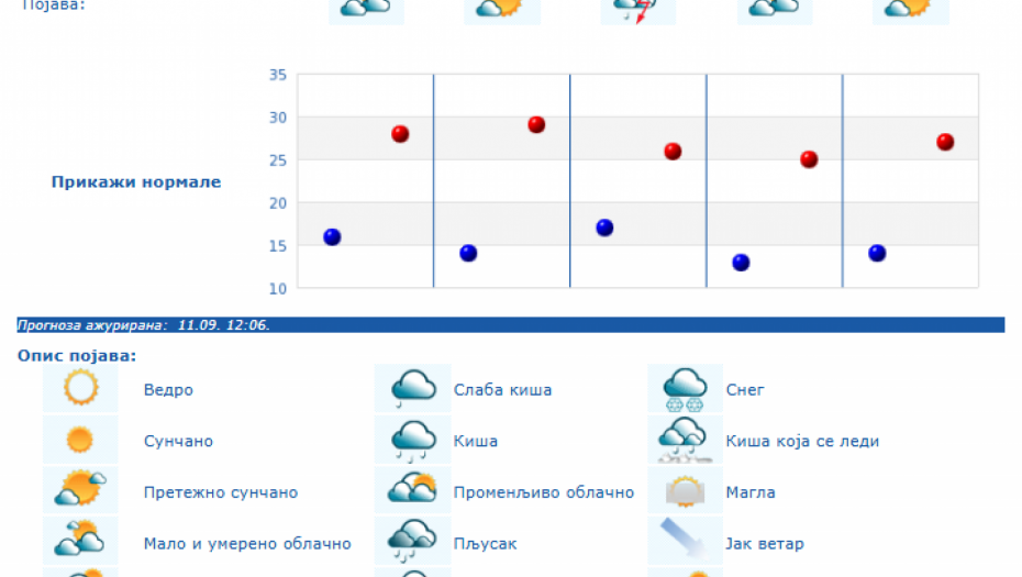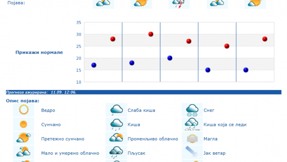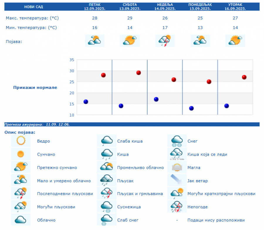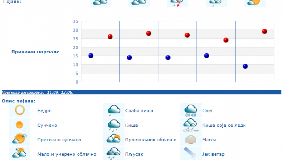 Duvaće slab, promenljiv vetar. Najniža temperatura biće od 14 do 18 stepeni, a najviša od 25 do 29.