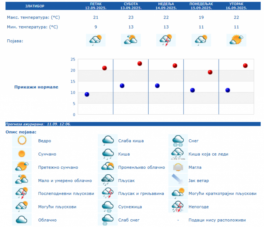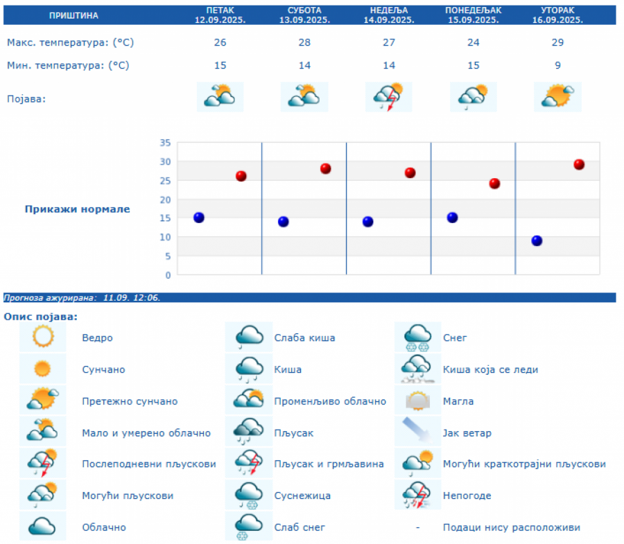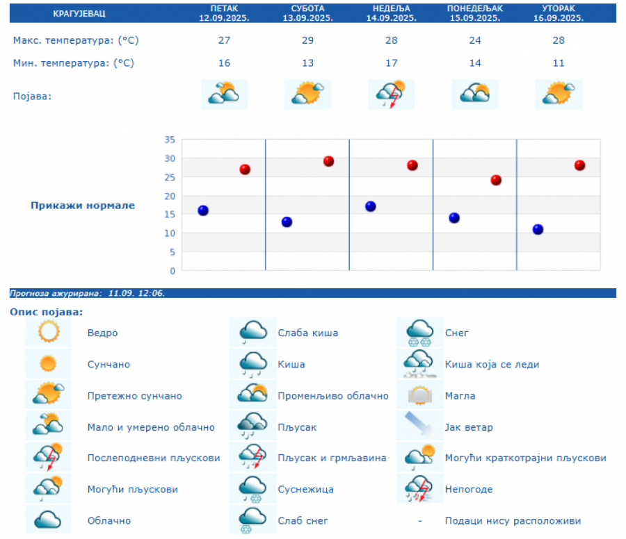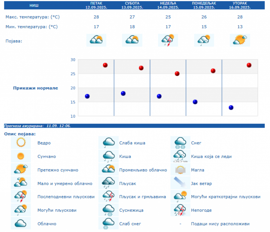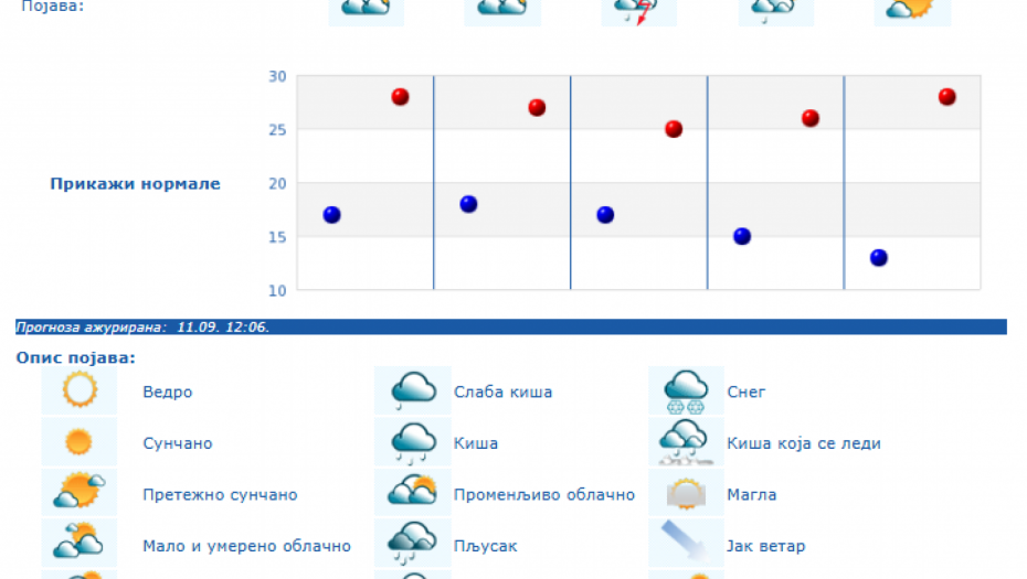 Duvaće slab, promenljiv vetar. Najniža temperatura biće od 14 do 18 stepeni, a najviša od 25 do 29.
