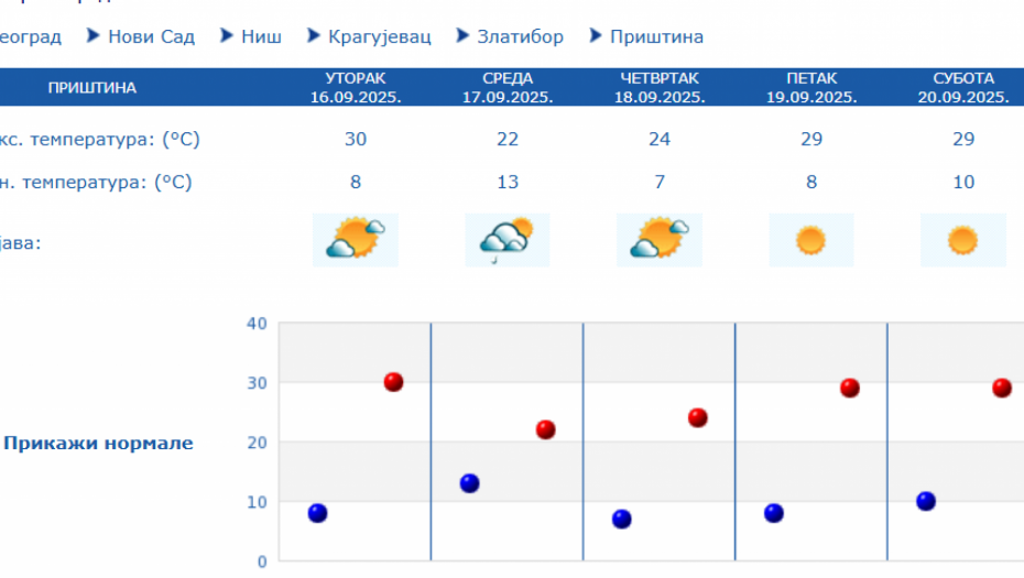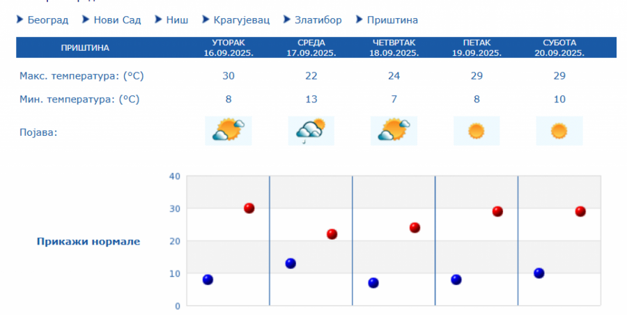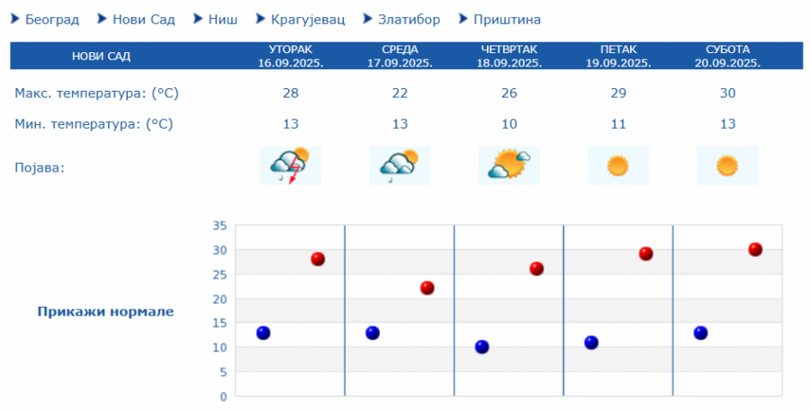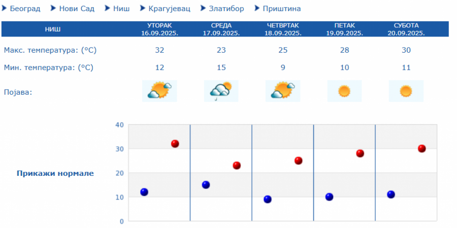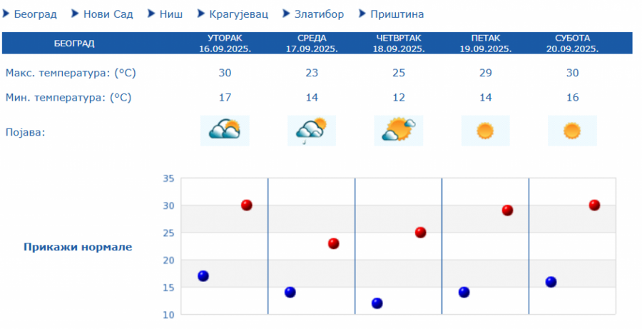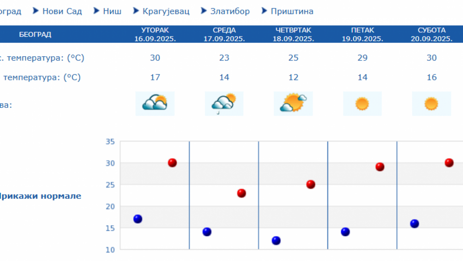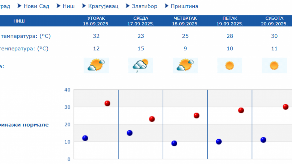 Od četvrtka do kraja perioda očekuje se pretežno sunčano vrene - jutra će biti prohladna, naročito u četvrtak i petak, a dnevne temperature u postepenom porastu, pa se za vikend i početkom naredne sedmice, od 20. do 23. septembra, ponovo očekuju vrednosti oko i malo iznad 30 stepeni Celzijusa.
