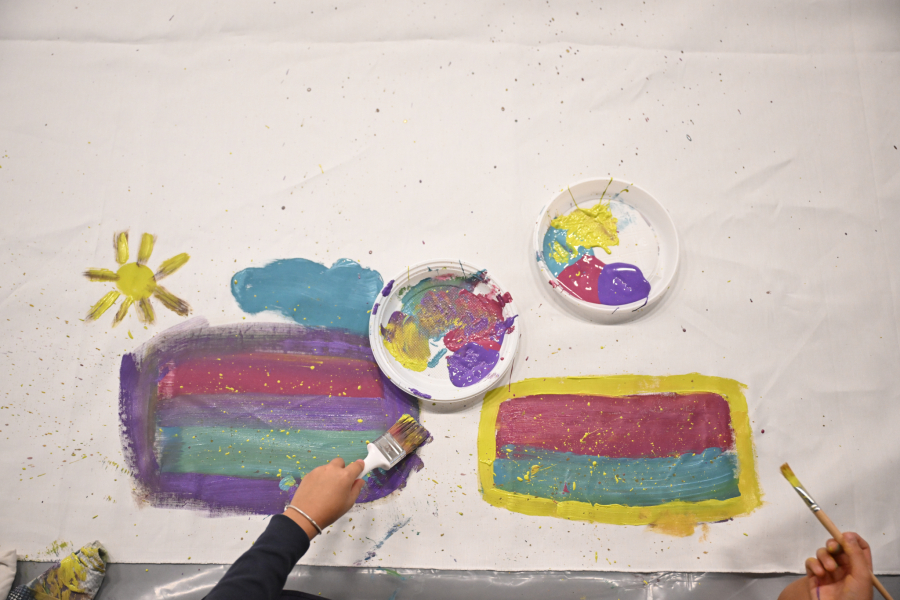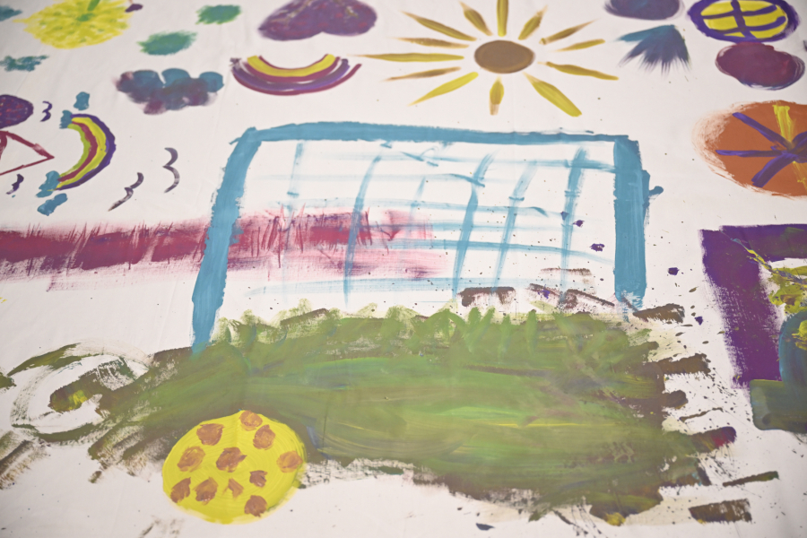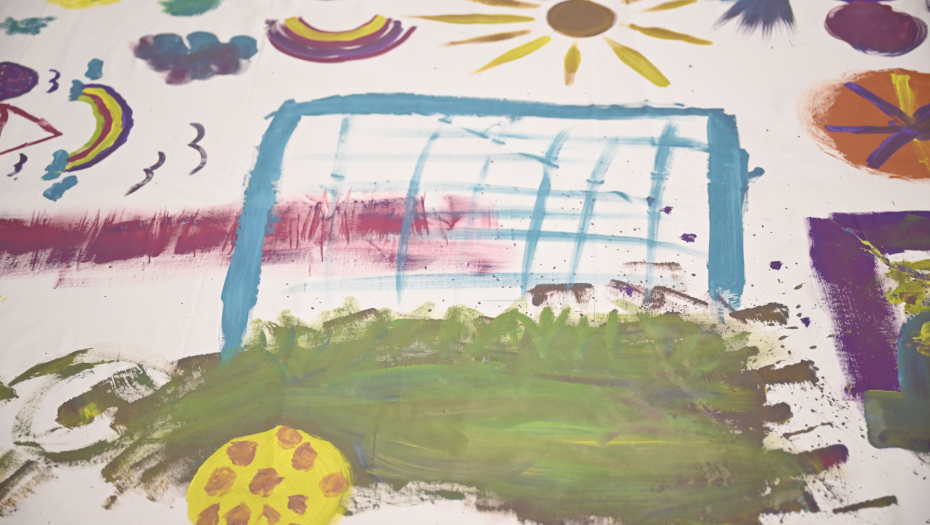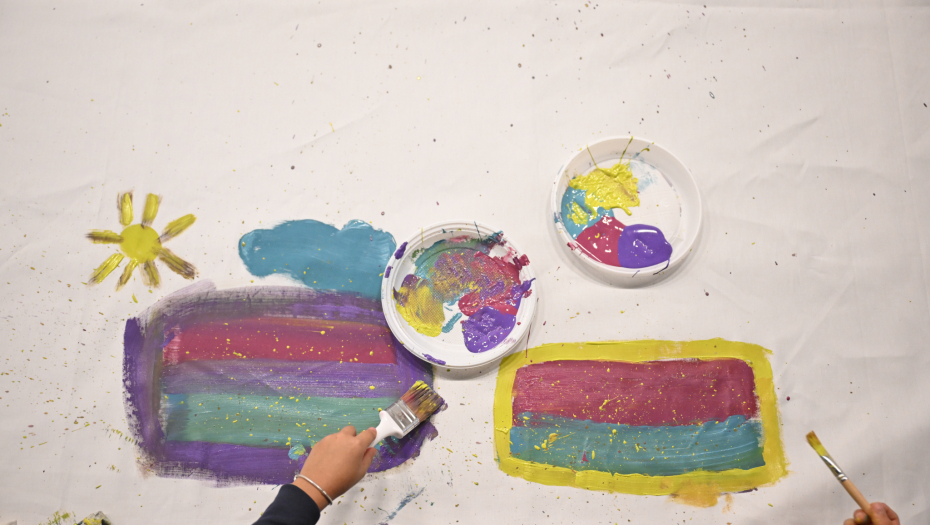 Mališani su na velikom platnu, pomoću boja i četkica, dali svoj doprinos obeležavanju današnjeg praznika tako što su zajedničkim snagama oslikali svoju zastavu mašte, detinjstva, igre i slobode.