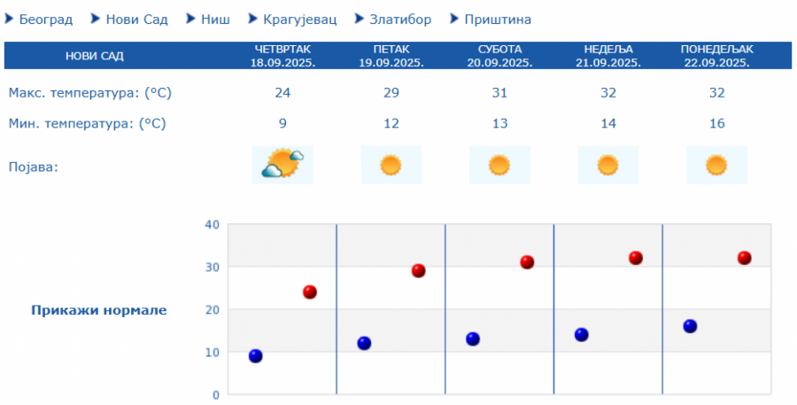 Duvaće slab i umeren vetar na istoku Srbije, kao i ponegde u planinskim predelima povremeno i jak severozapadni, a temperature će se kretati od pet do 26 stepeni.