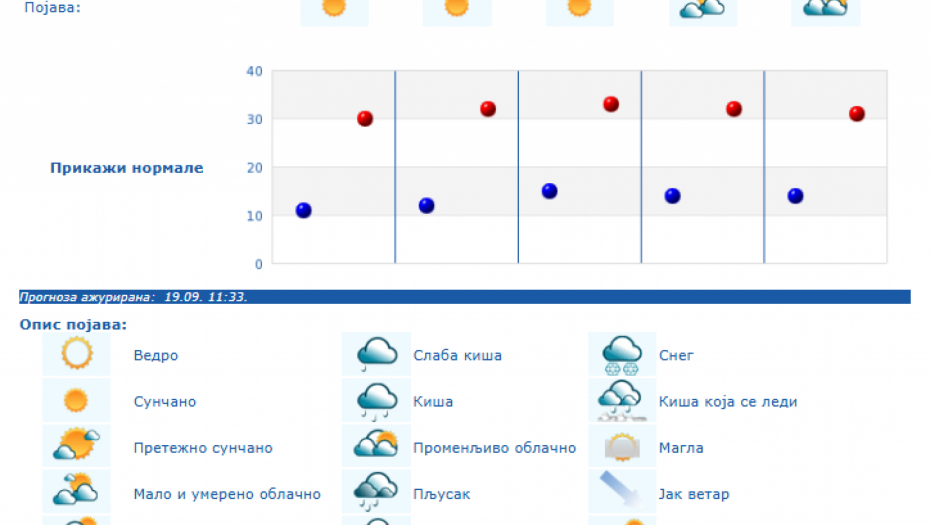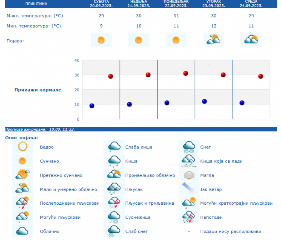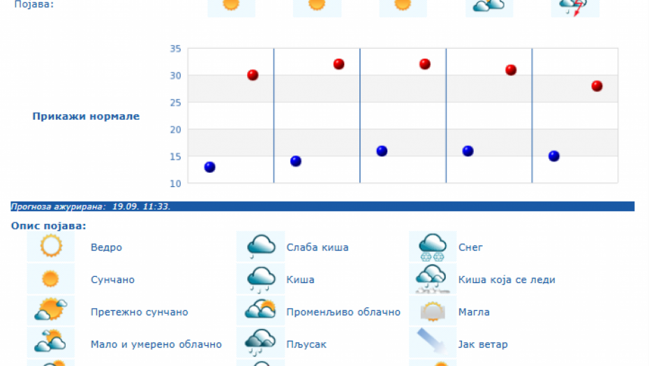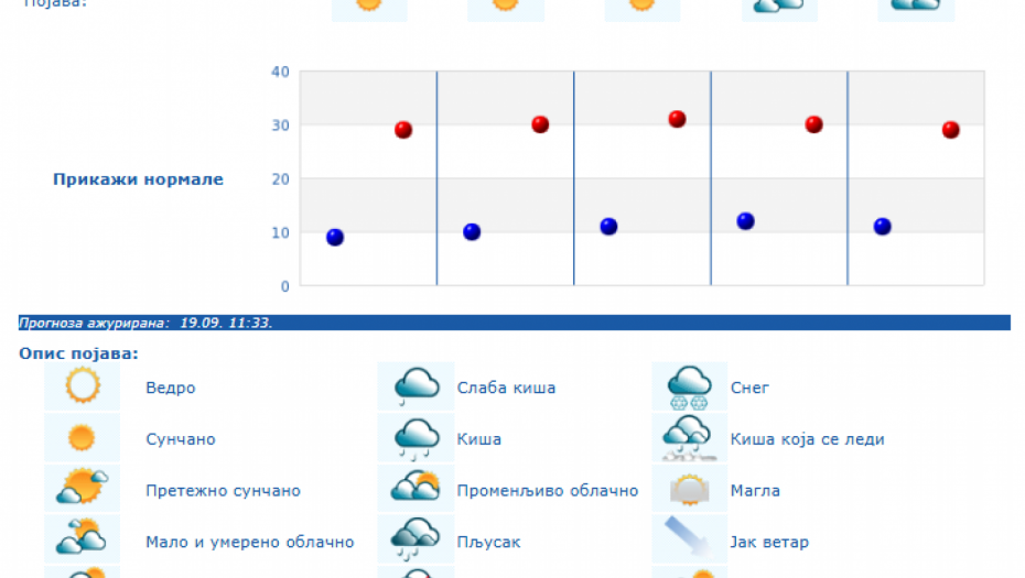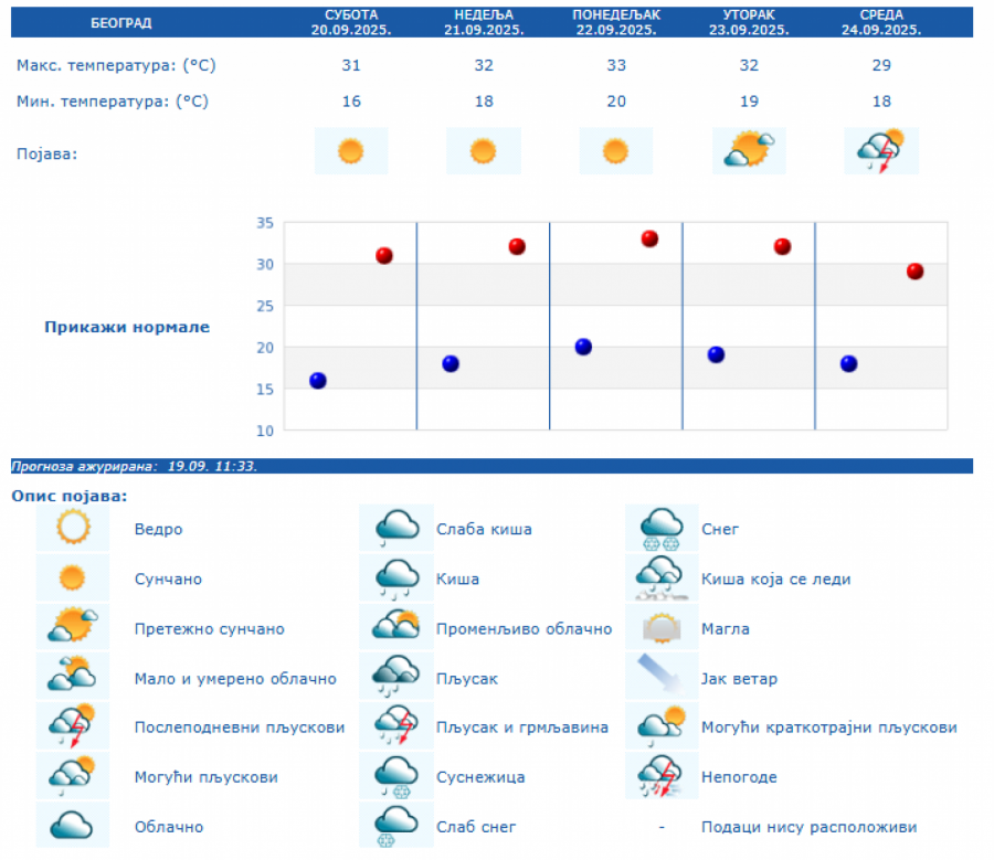 Jutarnja temperatura u glavnom gradu kretaće se od 14 do 16 stepeni, a najviša dnevna biće oko 31 stepen. Prema izgledima vremena za narednih sedam dana - do subote, 27. septembra, do utorka (23. septembra) biće pretežno sunčano, ujutro sveže, a tokom dana toplo sa najvišom dnevnom temperaturom oko i malo iznad 30 stepeni.