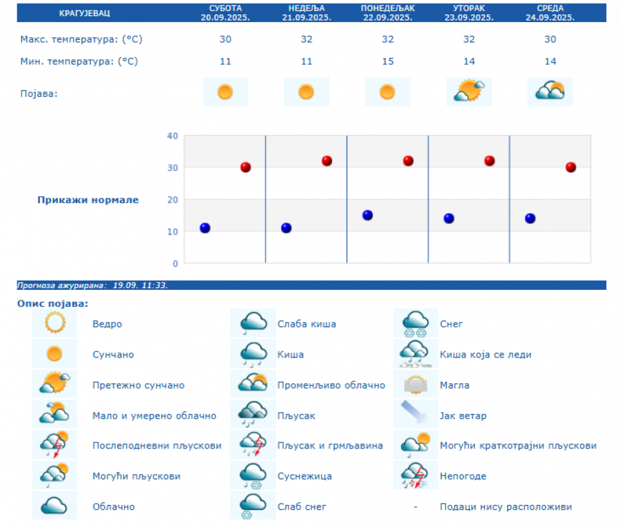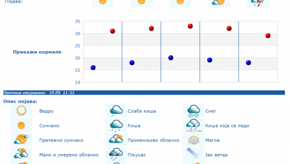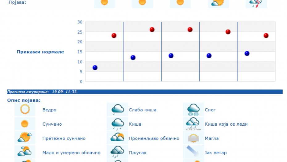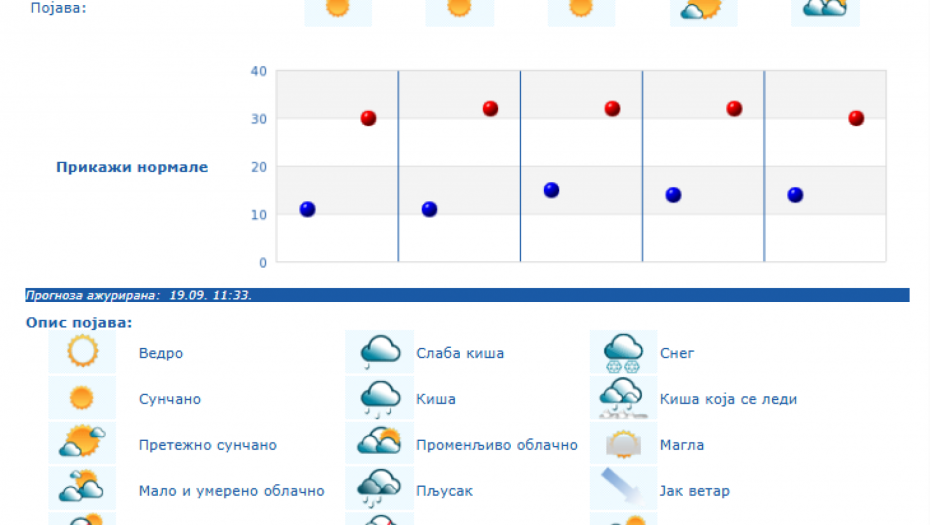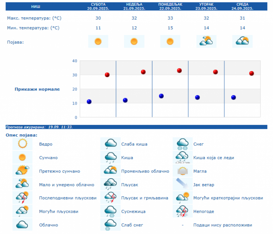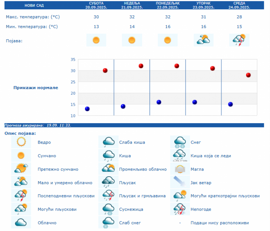 Jutarnja temperatura u glavnom gradu kretaće se od 14 do 16 stepeni, a najviša dnevna biće oko 31 stepen. Prema izgledima vremena za narednih sedam dana - do subote, 27. septembra, do utorka (23. septembra) biće pretežno sunčano, ujutro sveže, a tokom dana toplo sa najvišom dnevnom temperaturom oko i malo iznad 30 stepeni.