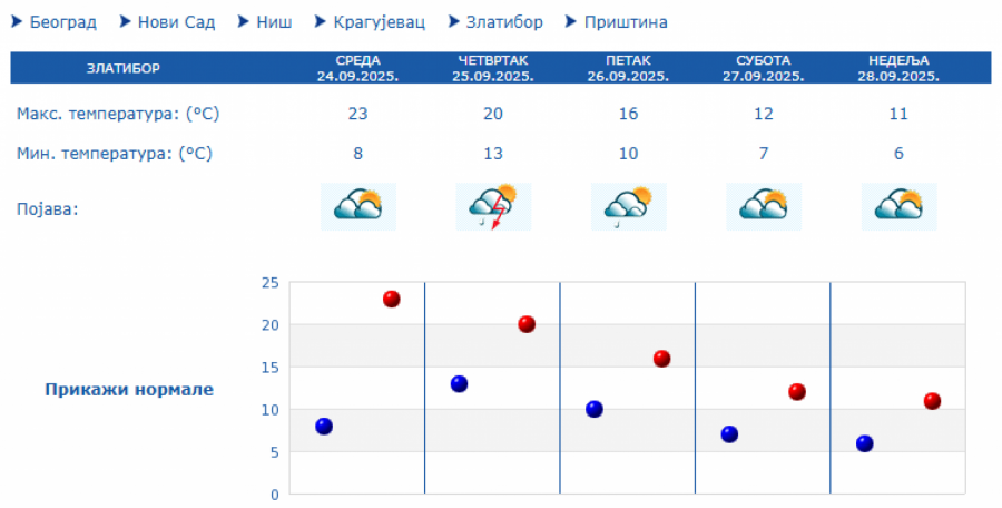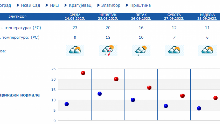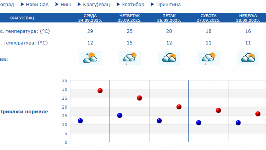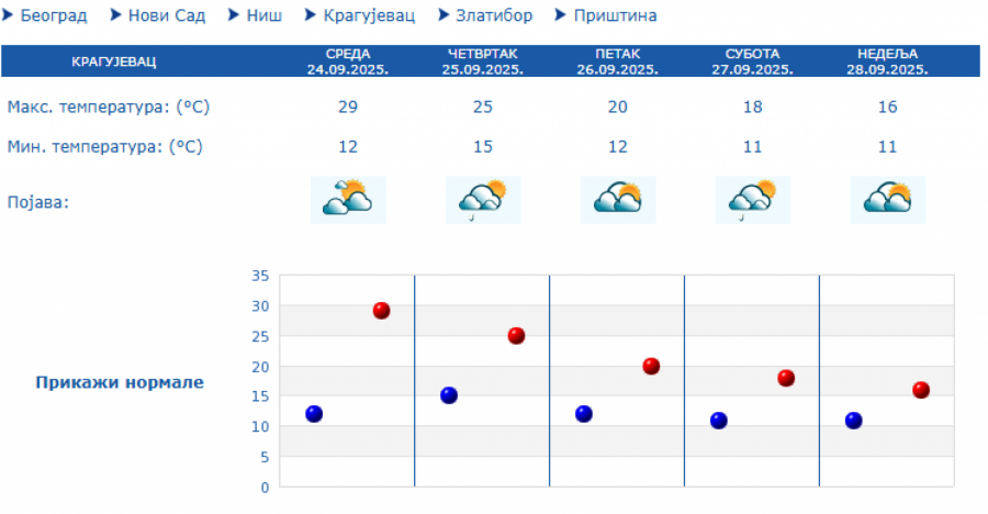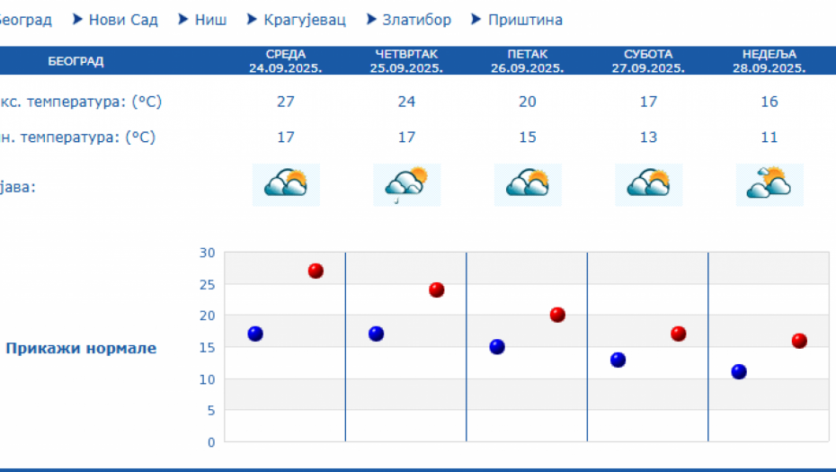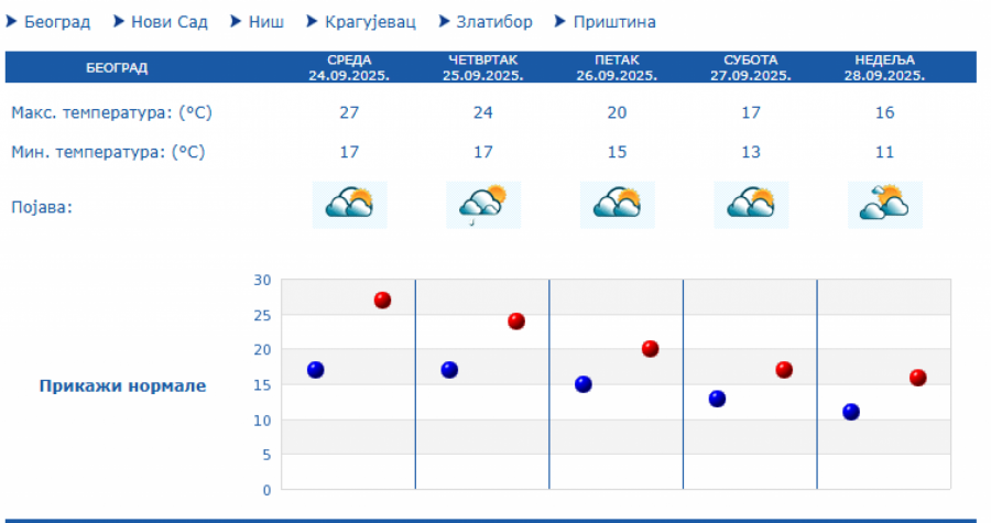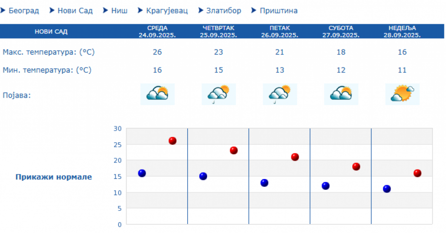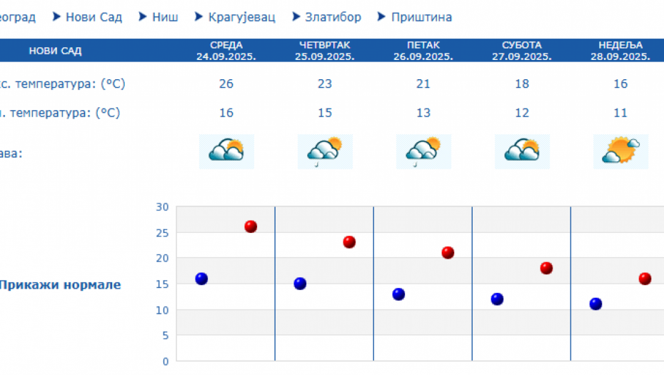 Prema izgledima vremena u Srbiji za narednih sedam dana - do 30. septembra, temperatura će biti u svakodnevnom i postepenom padu, a uz promenljivu oblačnost povremeno se očekuju i kratkotrajne padavine - kiša i lokalni pljuskovi sa grmljavinom, i to u sredu uveče i tokom noći u Vojvodini i zapadnoj Srbiji, a od četvrtka i u ostalim krajevima, kada će ponovo početi da duva košava, jak jugoistočni vetar sa olujnim udarima na jugu Banata i u donjem Podunavlju.