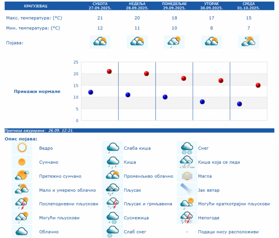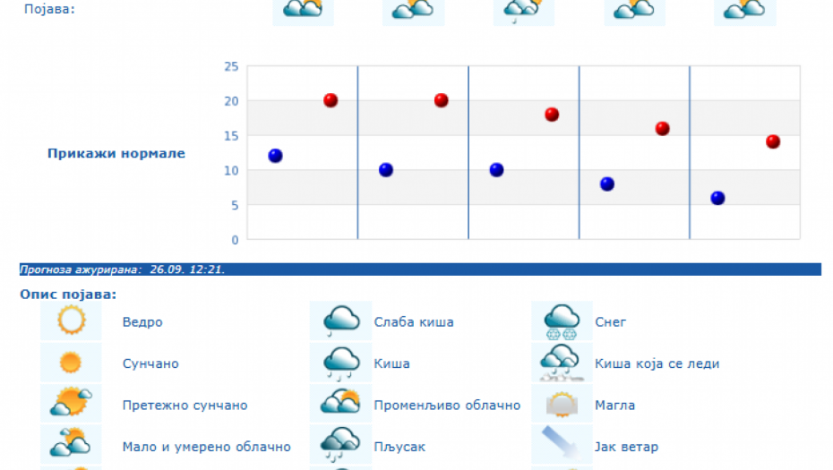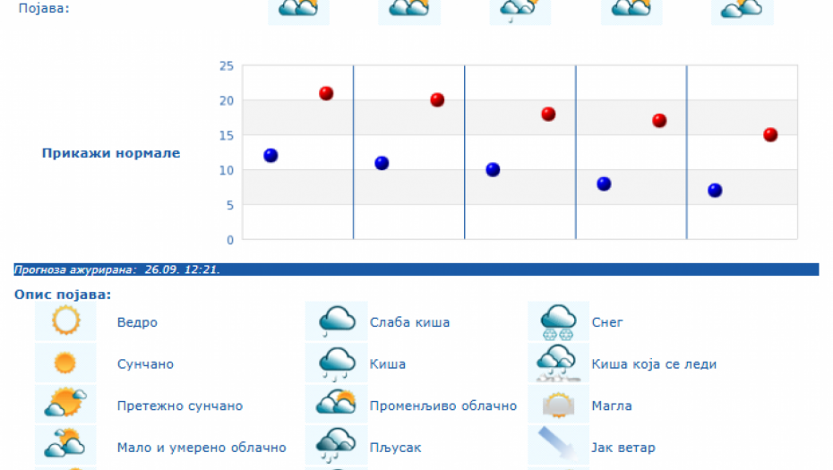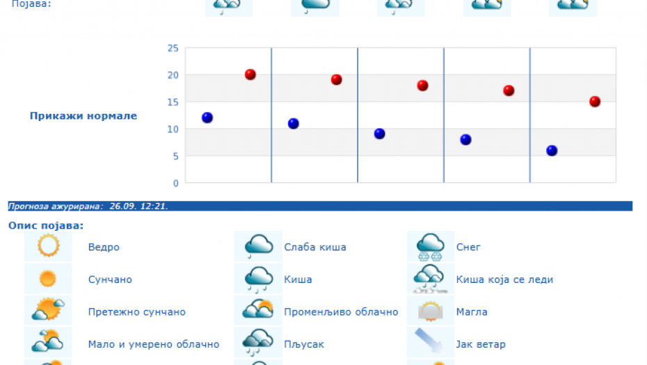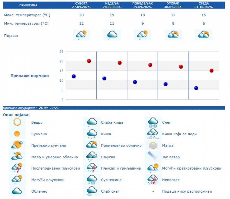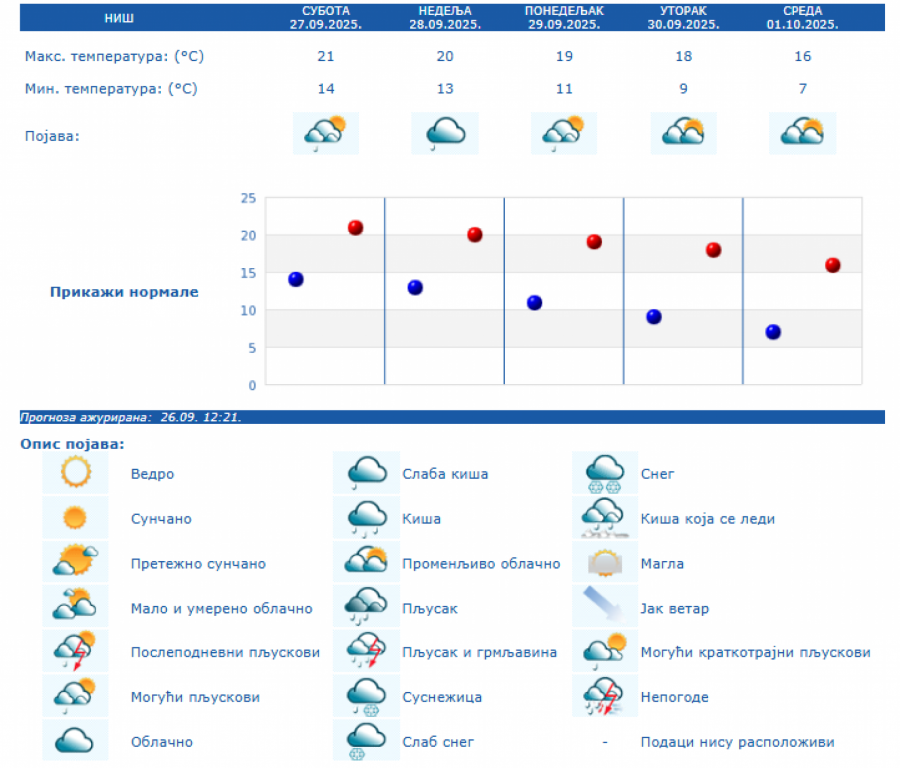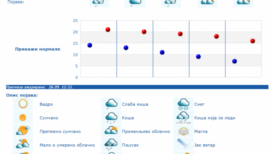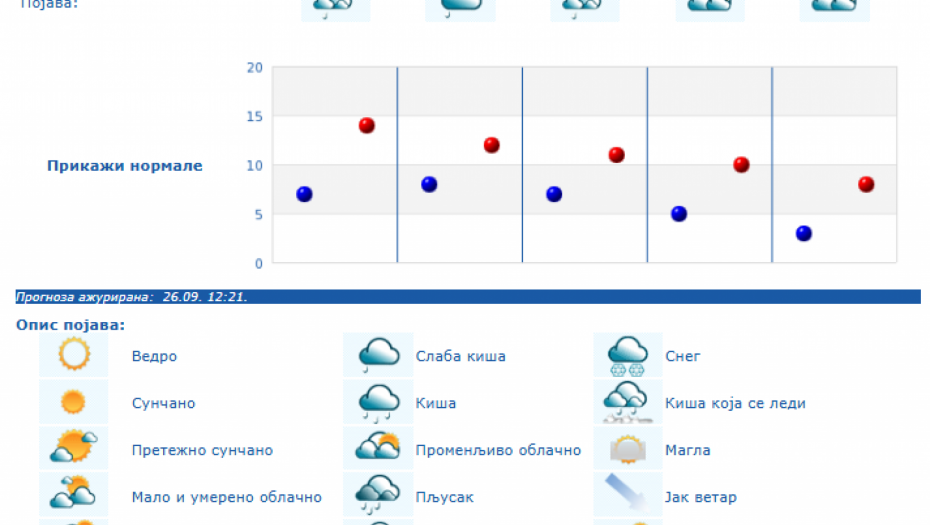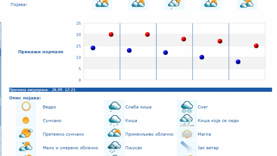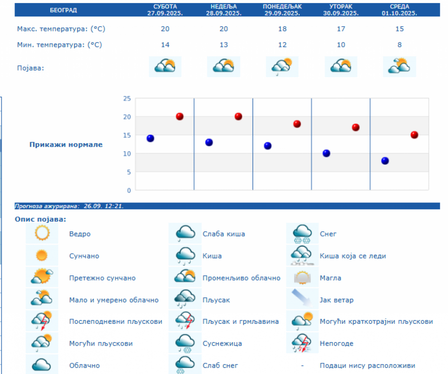 Prema izgledima vremena u Srbiji za narednih sedam dana, do 4. oktobra, vreme će biti sveže, u većini mesta sa najvišom dnevnom temperaturom od 16 do 20 stepeni, a u drugoj polovini sledeće sedmice i još malo hladnije. Od nedelje će košava oslabiti, a vetar će biti u skretanju na severozapadni. Tokom dana očekuje se promenljivo vreme, a kiša se očekuje uglavnom u brdsko-planinskim predelima, u ponedeljak ponegde i na severu zemlje.