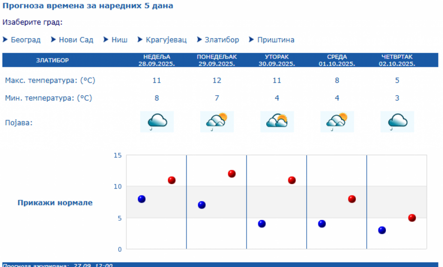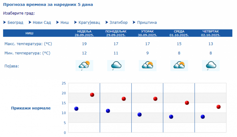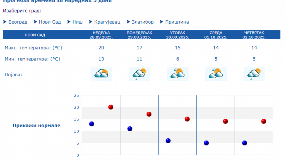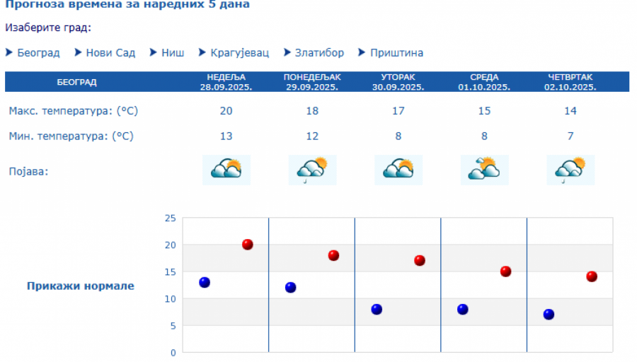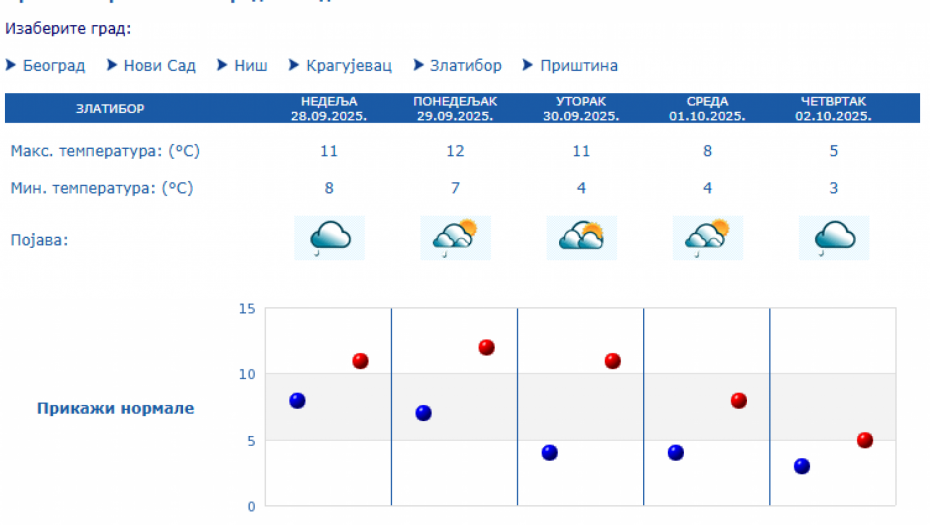Tokom dana očekuje se promenljivo vreme, u većini dana mestimično sa kišom i kratkotrajnim pljuskovima, koja se od petka (3. oktobra) očekuje još samo na jugu i jugoistoku zemlje.