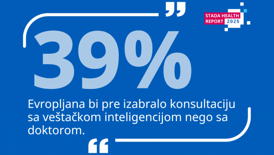 Beograd, 30. septembar 2025. – Oko 39% Evropljana pre prihvata konsultacije sa veštačkom inteligencijom umesto sa lekarom, poručuje ŠTADA zdravstveni izveštaj za 2025. godinu. Među mlađim generacijama (18–45 godina), ta brojka je još veća i iznosi 45%. Pobornici veštačke inteligencije u zdravstvu ističu stalnu dostupnost, brze odgovore i objektivne povratne informacije. Neki se čak osećaju sigurnije deleći lične zdravstvene podatke sa digitalnim interfejsom nego sa ljudskim bićem.