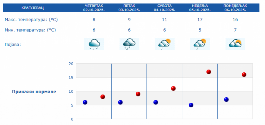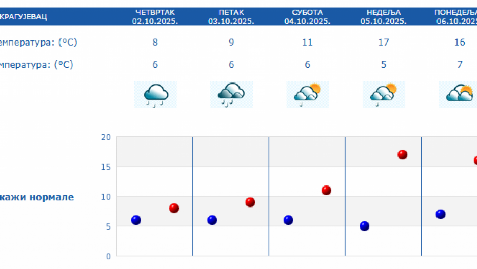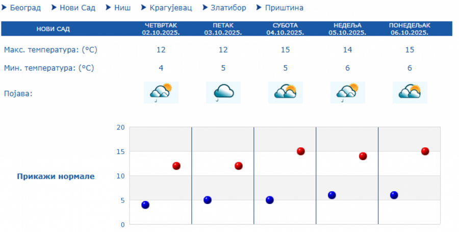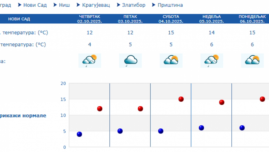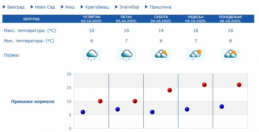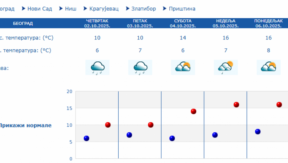 U upozorenju za područje južne, centralne i istočne Srbije na obilnu kišu za 2. i 3. oktobar, RHMZ navodi da će u četvrtak i petak biti oblačno sa kišom i hladno, osim na severozapadu Vojvodine gde će se zadržati suvo vreme. Printscreen/ RHMZ