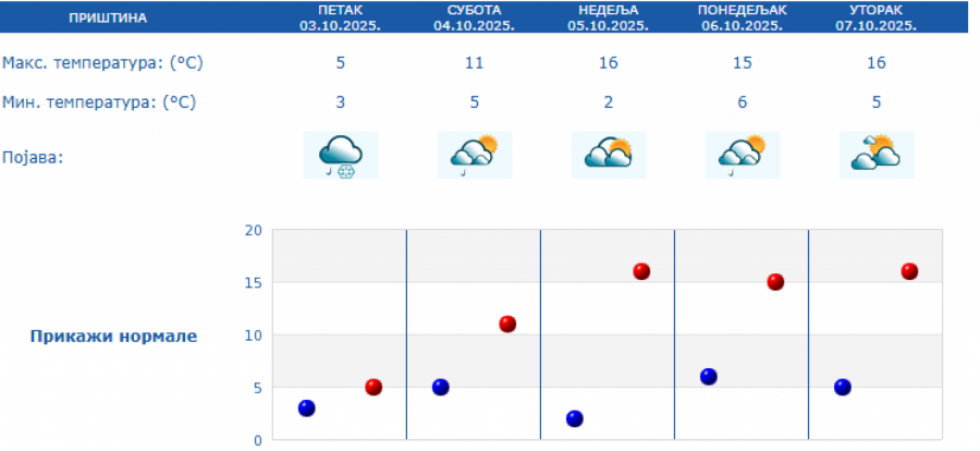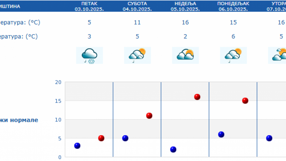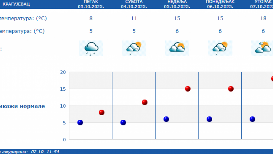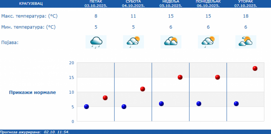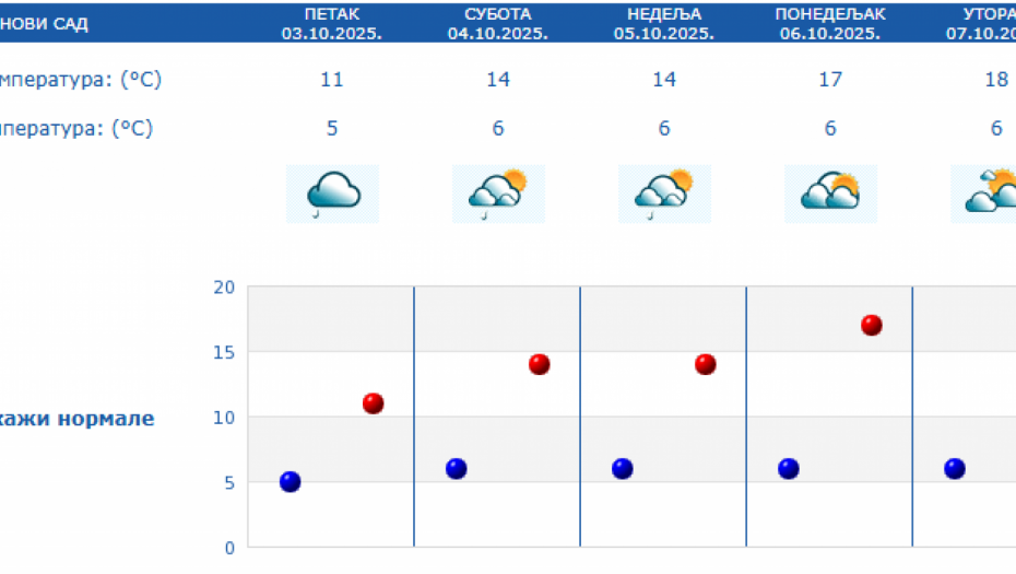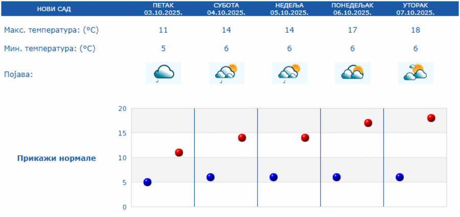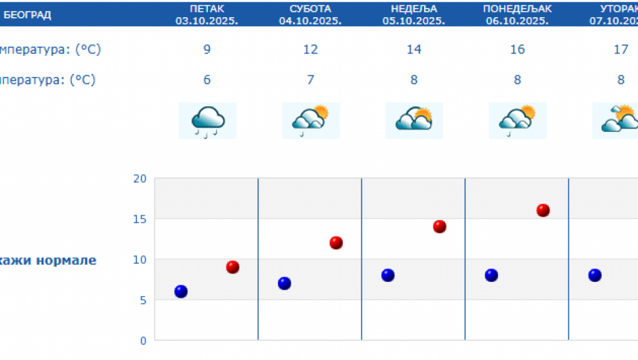 Prema izgledima vremena u Srbiji za narednih sedam dana, do 10. oktobra, u subotu će biti pretežno oblačno i malo toplije uz postepeni prestanak padavina i slabljenje vetra ujutro i pre podne, a posle podne i uveče i postepeno razvedravanje sa zapada.