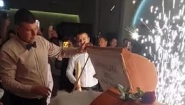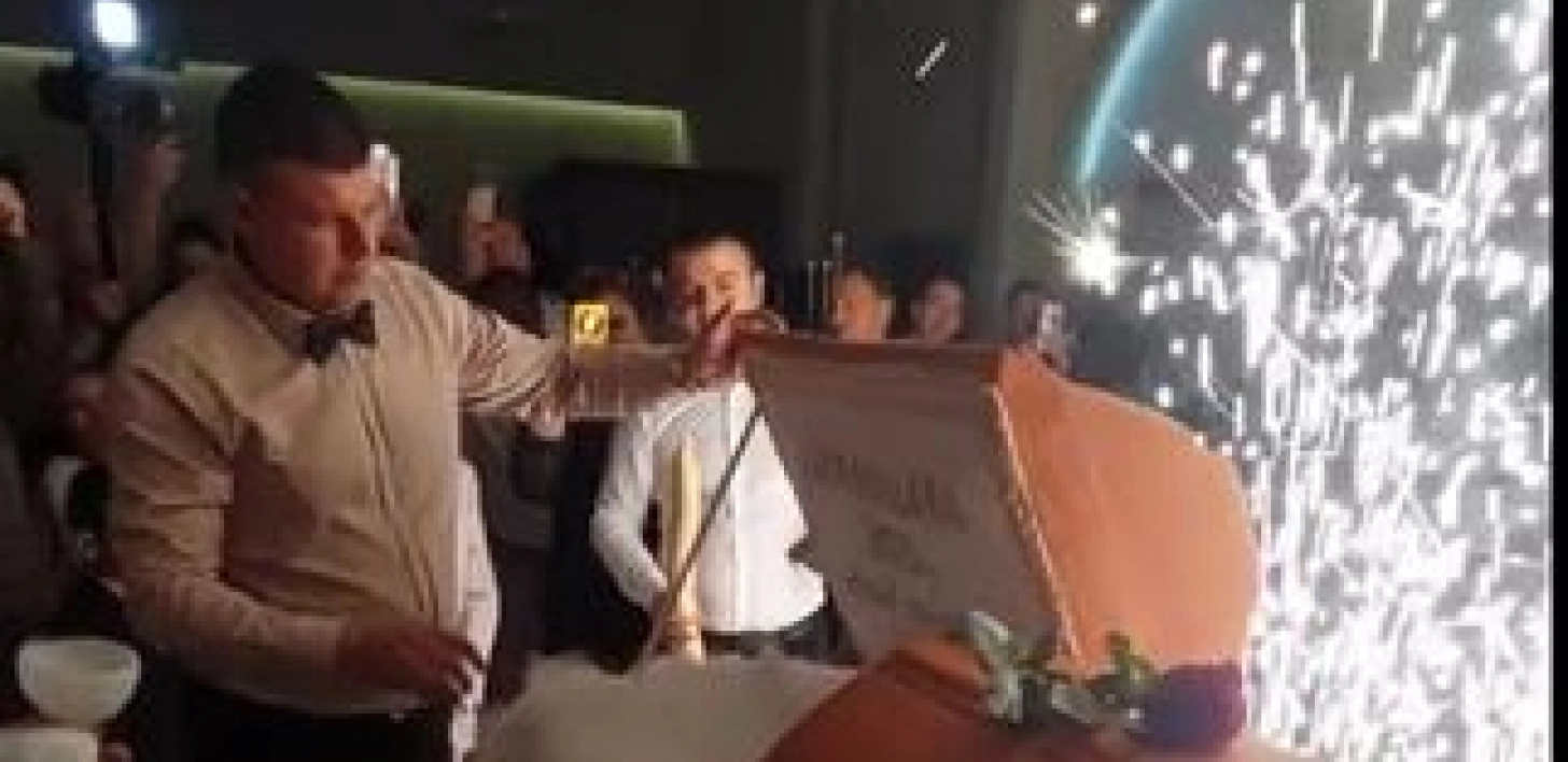 Na snimku objavljenom na TikTok-u može se videti kako okupljeni snimaju tortu iz koje se diže dim, dok u pozadini svira pogrebni orkestar, a iza torte pršti vatromet.