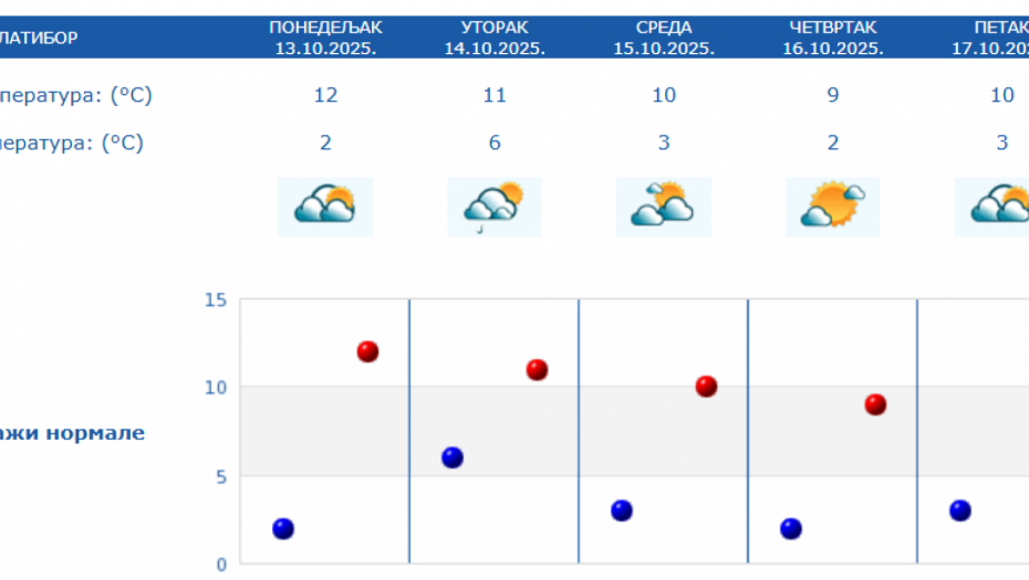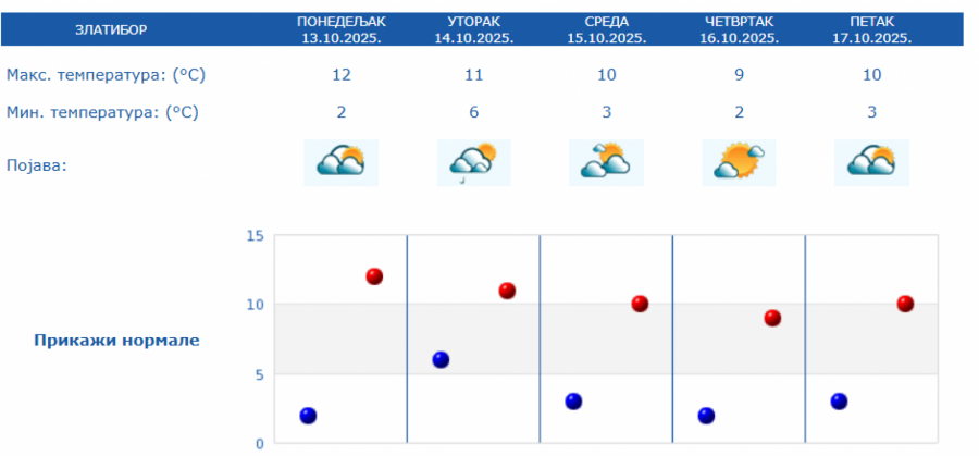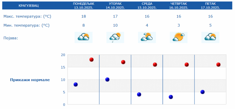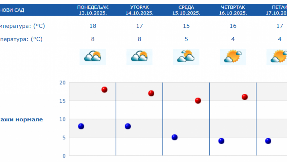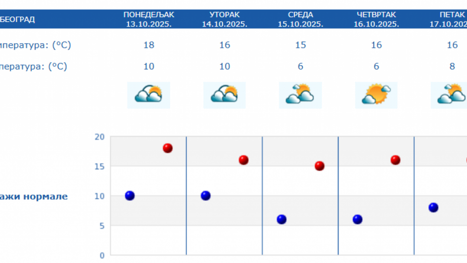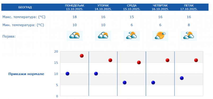 U toku naredne nedelje očekuje se suvo vreme sa dužim sunčanim intervalima, uz blagi pad dnevne temperature, koja će u većini mesta biti između 15 i 18 °C, dok će jutra u drugoj polovini nedelje biti svežija. Naoblačenje sa kišom i lokalnim pljuskovima očekuje se u petak posle podne u južnim predelima, dok će tokom vikenda zahvatiti i zapadne, centralne i istočne krajeve Srbije.