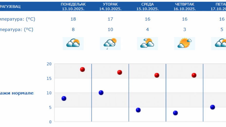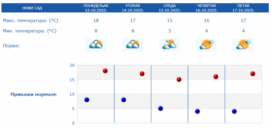 Kako stoji u najavi, danas će na severozapadu Srbije i u Negotinskoj Krajini biti pretežno sunčano, dok se u ostalim krajevima očekuje umereno do potpuno oblačno vreme, sa postepenim smanjenjem oblačnosti do kraja dana. Vetar će biti slab i umeren, na istoku povremeno jak, zapadni i severozapadni. Najviša dnevna temperatura kretaće se od 17 do 21 °C.