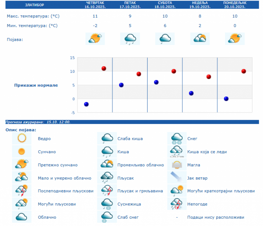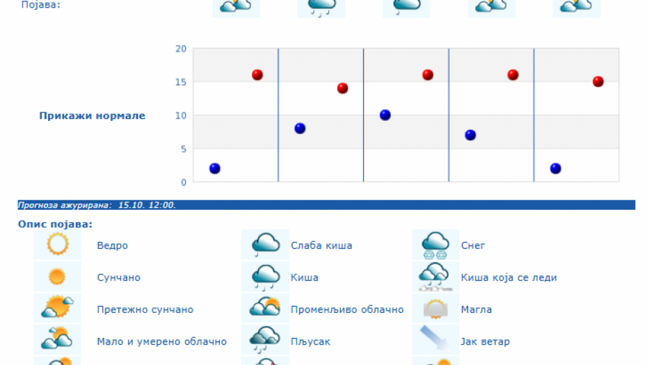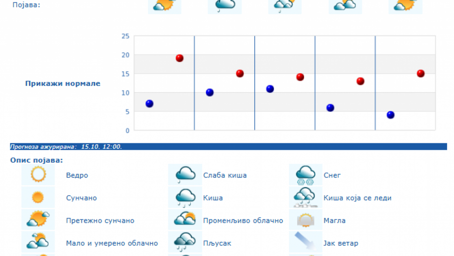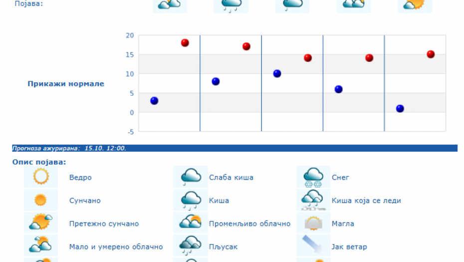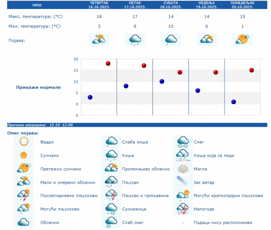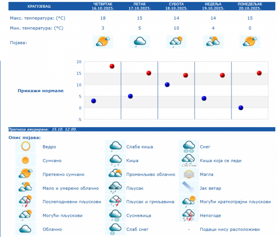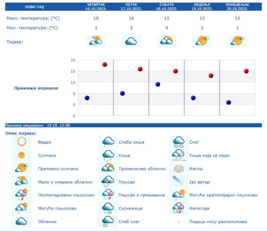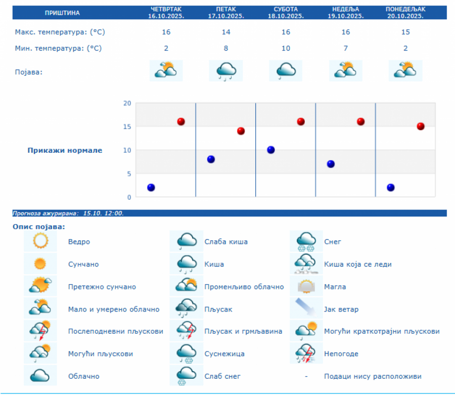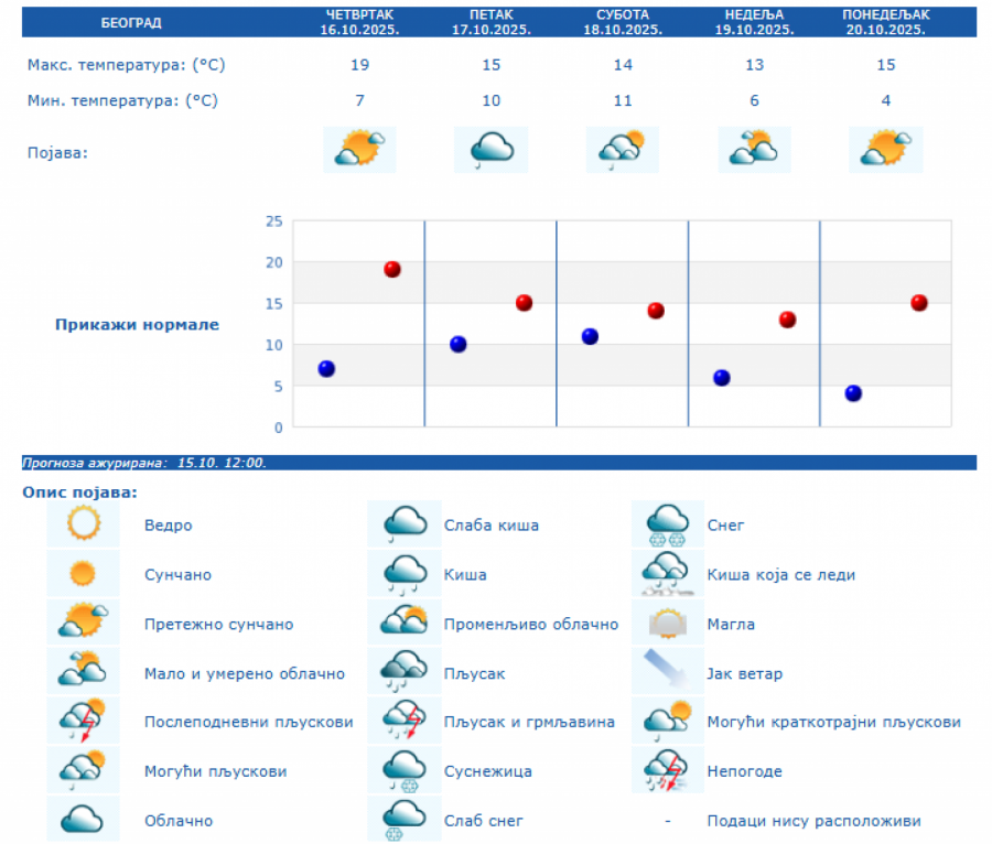 Prema izgledima vremena u Srbiji za narednih sedam dana, do 23. oktobra, u petak će biti oblačno, a kiša će se sa jugozapada i juga Srbije do kraja dana i u toku noći ka suboti proširiti i na većinu ostalih krajeva, dok će se u većem delu Vojvodine zadržati suvo.